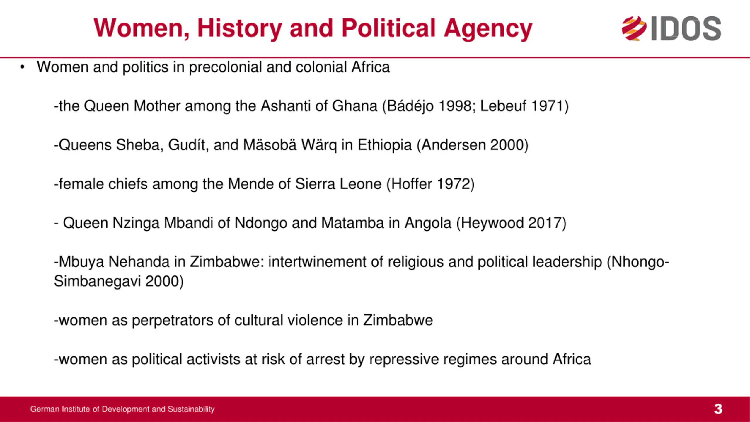 Women, History and Political Agency Women and politics in precolonial and colonial Africa -the Queen Mother among the Ashanti of Ghana (B d jo 1998; Lebeuf 1971) -Queens Sheba, Gud t, and M sob W rq in Ethiopia (Andersen 2000) -female chiefs among the Mende of Sierra Leone (Hoffer 1972) - Queen Nzinga Mbandi of Ndongo and Matamba in Angola (Heywood 2017) -Mbuya Nehanda in Zimbabwe: intertwinement of religious and political leadership (Nhongo- Simbanegavi 2000) -women as perpetrators of cultural violence in Zimbabwe -women as political activists at risk of arrest by repressive regimes around Africa 3 German Institute of Development and Sustainability