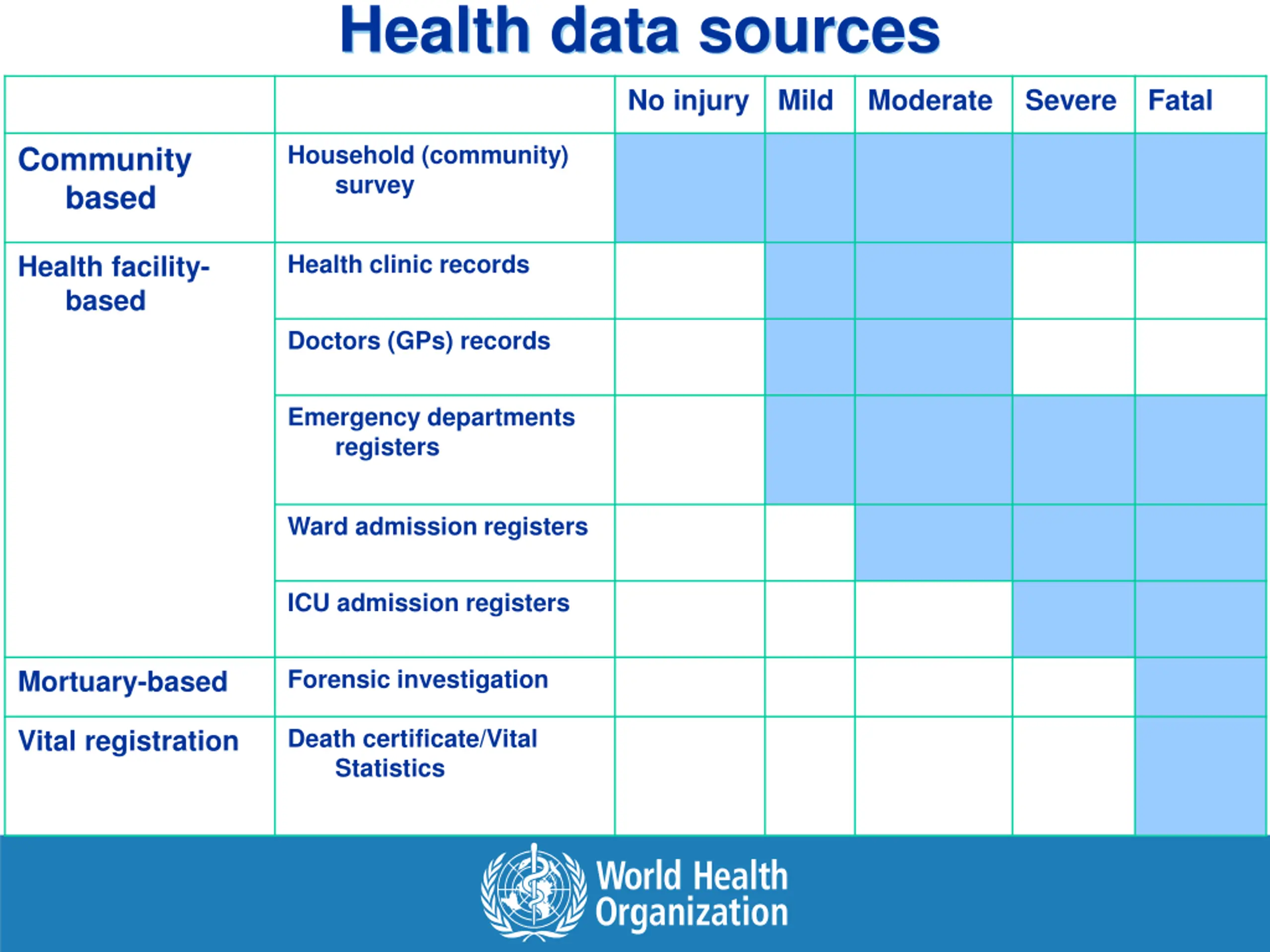 Health data sources No injury Mild Moderate Severe Fatal Household (community) survey Community based Health clinic records Health facility- based Doctors (GPs) records Emergency departments registers Ward admission registers ICU admission registers Forensic investigation Mortuary-based Death certificate/Vital Statistics Vital registration