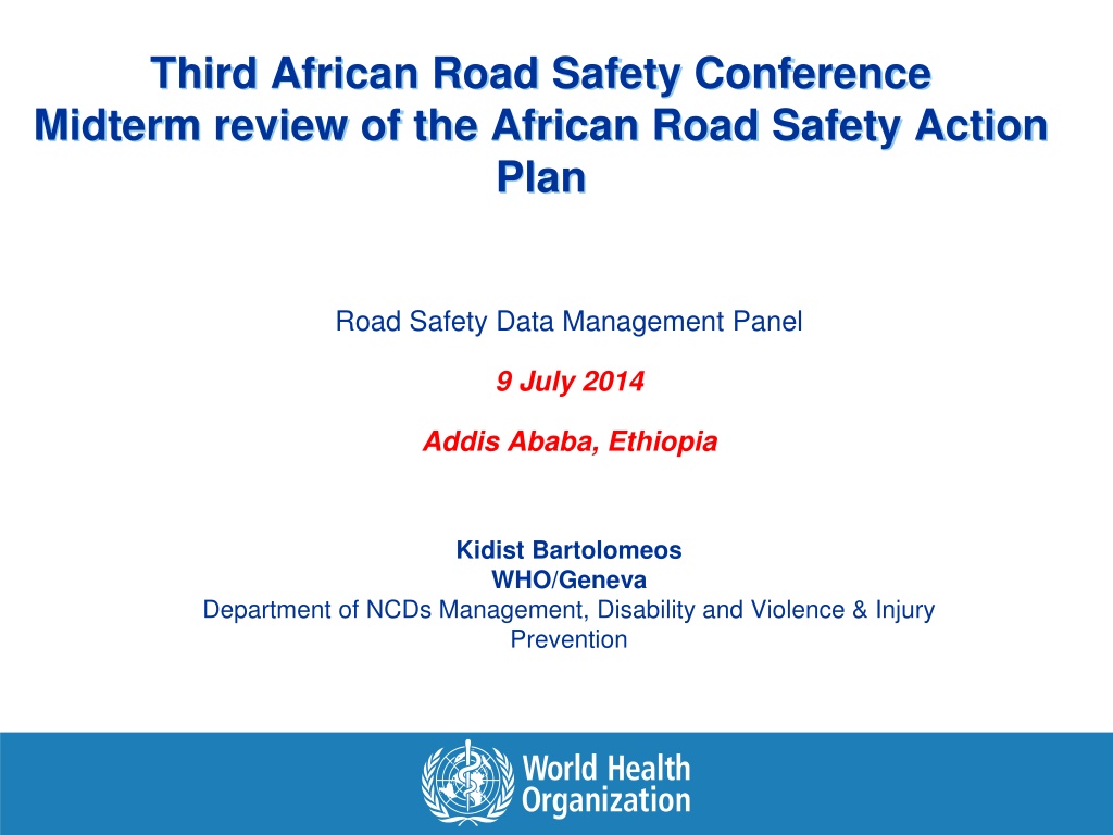 Third African Road Safety Conference Midterm review of the African Road Safety Action Plan Road Safety Data Management Panel 9 July 2014 Addis Ababa, Ethiopia Kidist Bartolomeos WHO/Geneva Department of NCDs Management, Disability and Violence & Injury Prevention