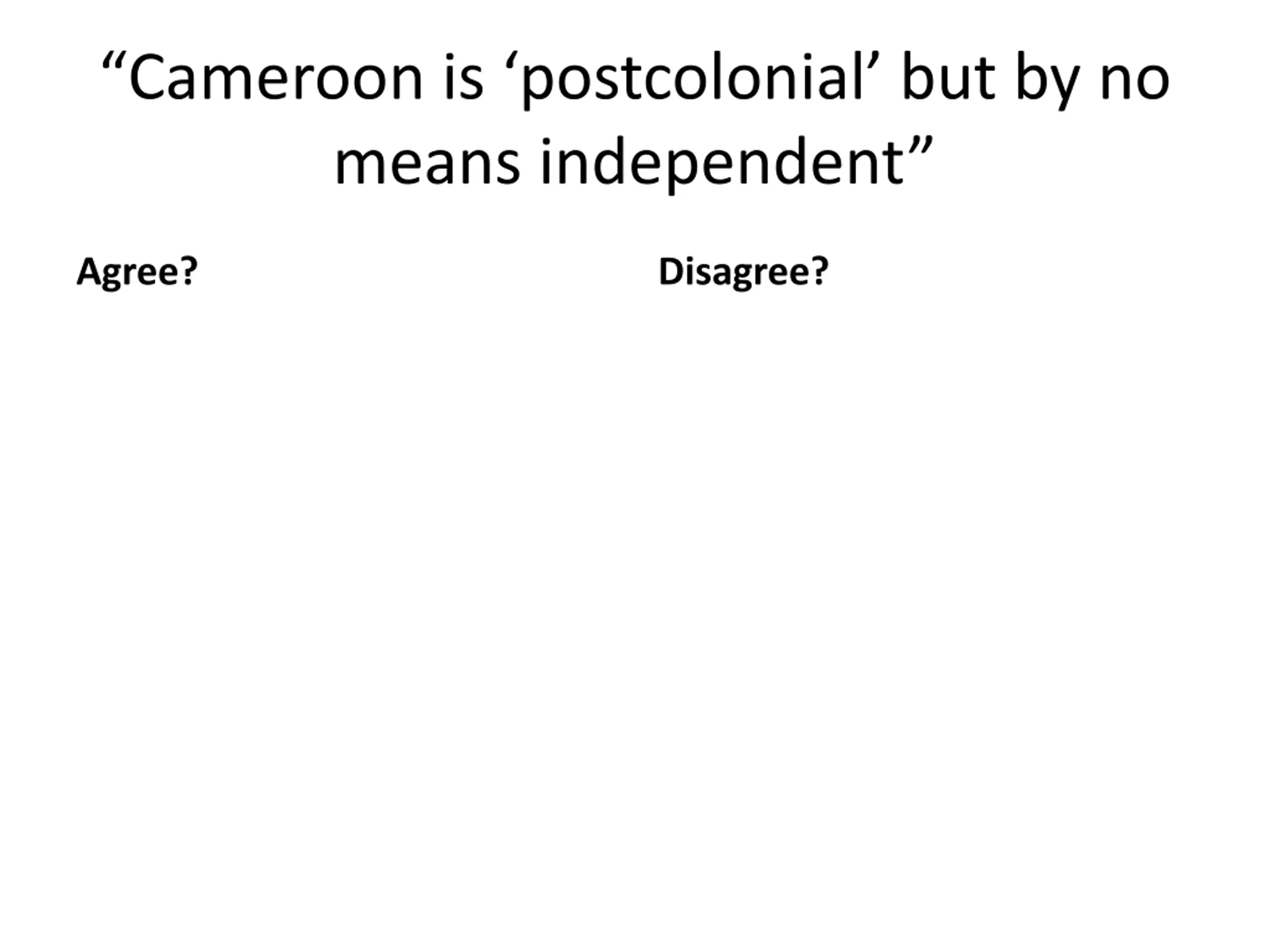 Cameroon is postcolonial but by no means independent Agree? Disagree?