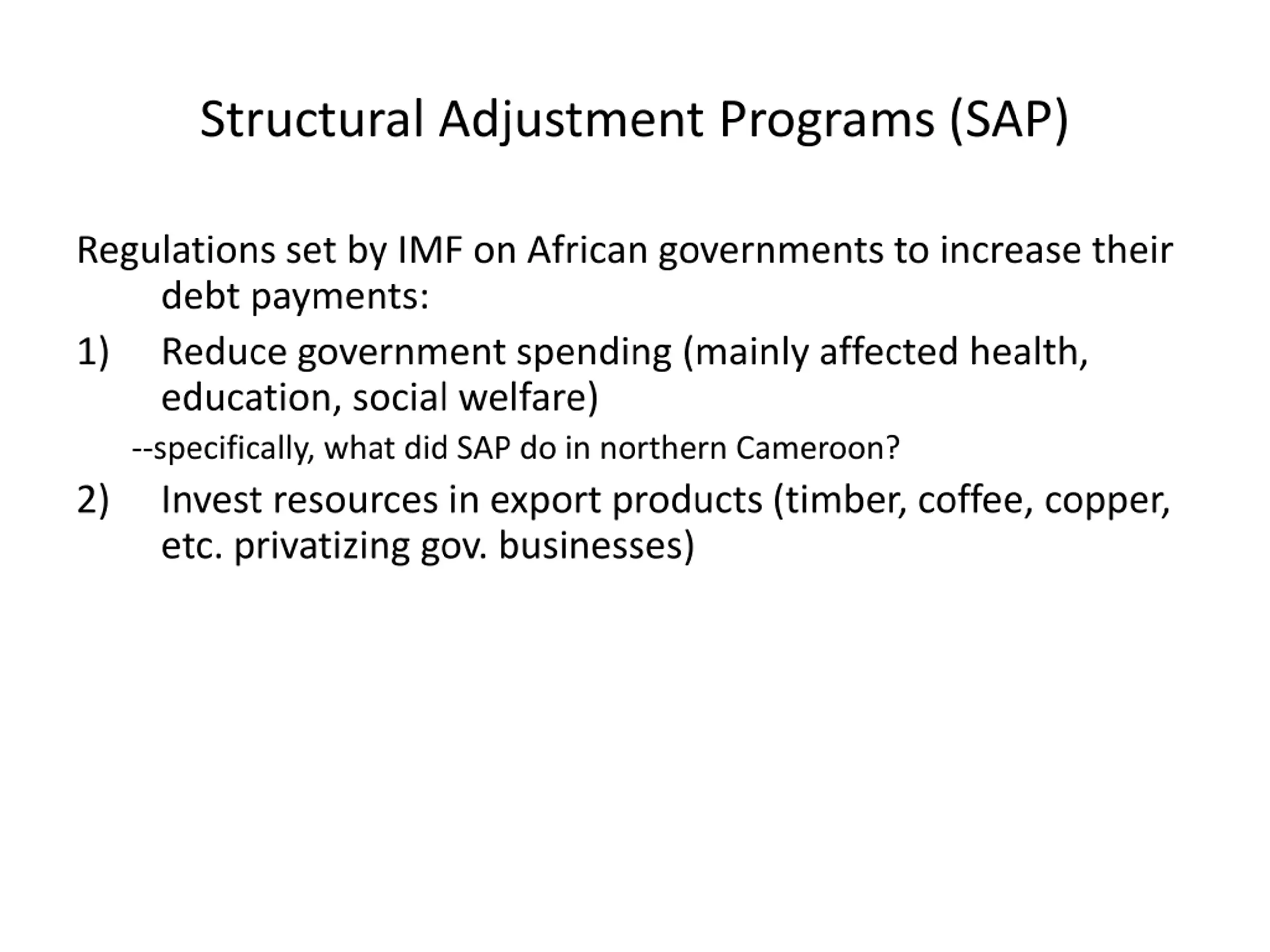 Structural Adjustment Programs (SAP) Regulations set by IMF on African governments to increase their debt payments: 1) Reduce government spending (mainly affected health, education, social welfare) --specifically, what did SAP do in northern Cameroon? 2) Invest resources in export products (timber, coffee, copper, etc. privatizing gov. businesses)