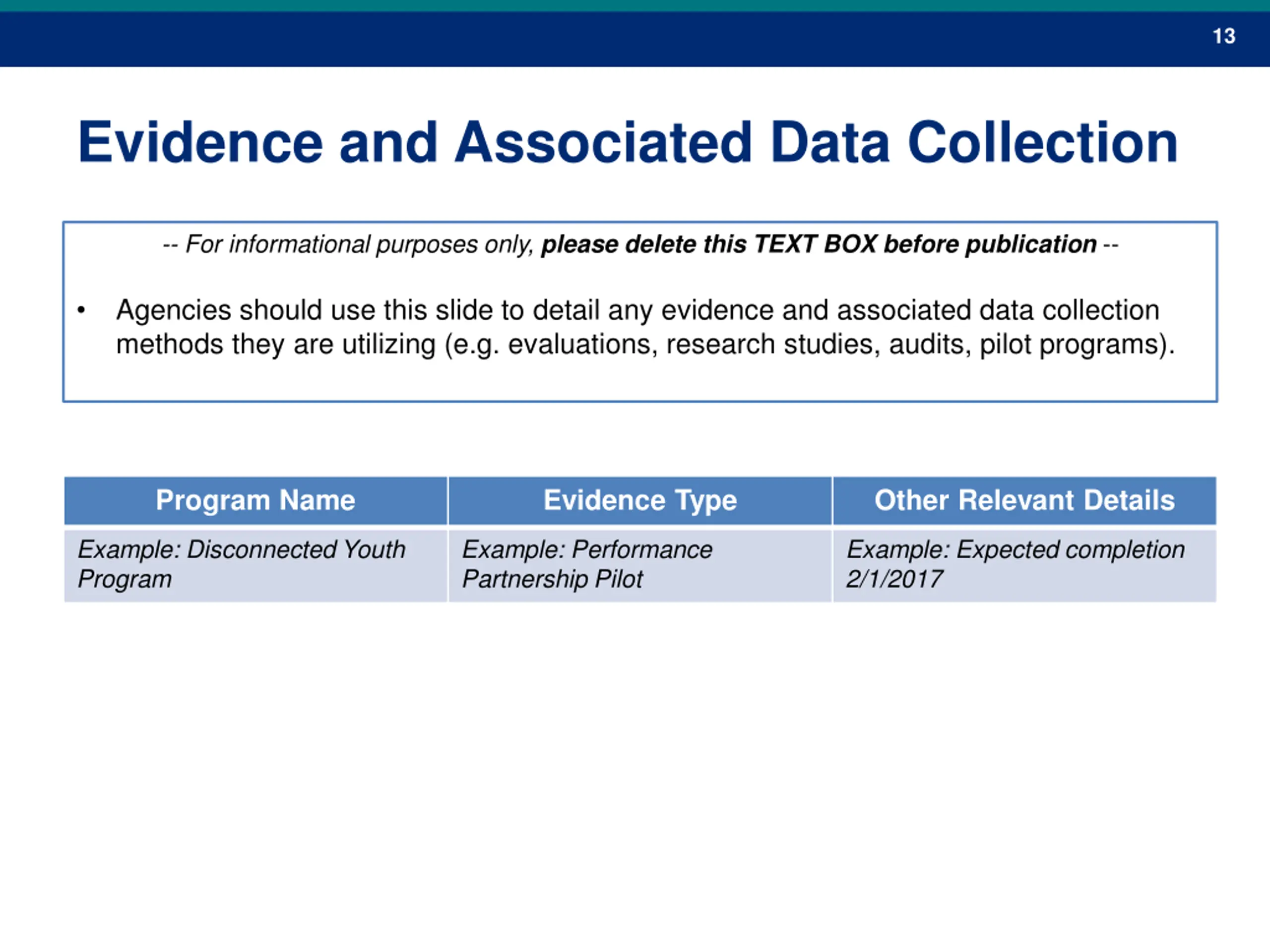 13 Evidence and Associated Data Collection -- For informational purposes only, please delete this TEXT BOX before publication -- Agencies should use this slide to detail any evidence and associated data collection methods they are utilizing (e.g. evaluations, research studies, audits, pilot programs). Program Name Evidence Type Other Relevant Details Example: Disconnected Youth Program Example: Performance Partnership Pilot Example: Expected completion 2/1/2017