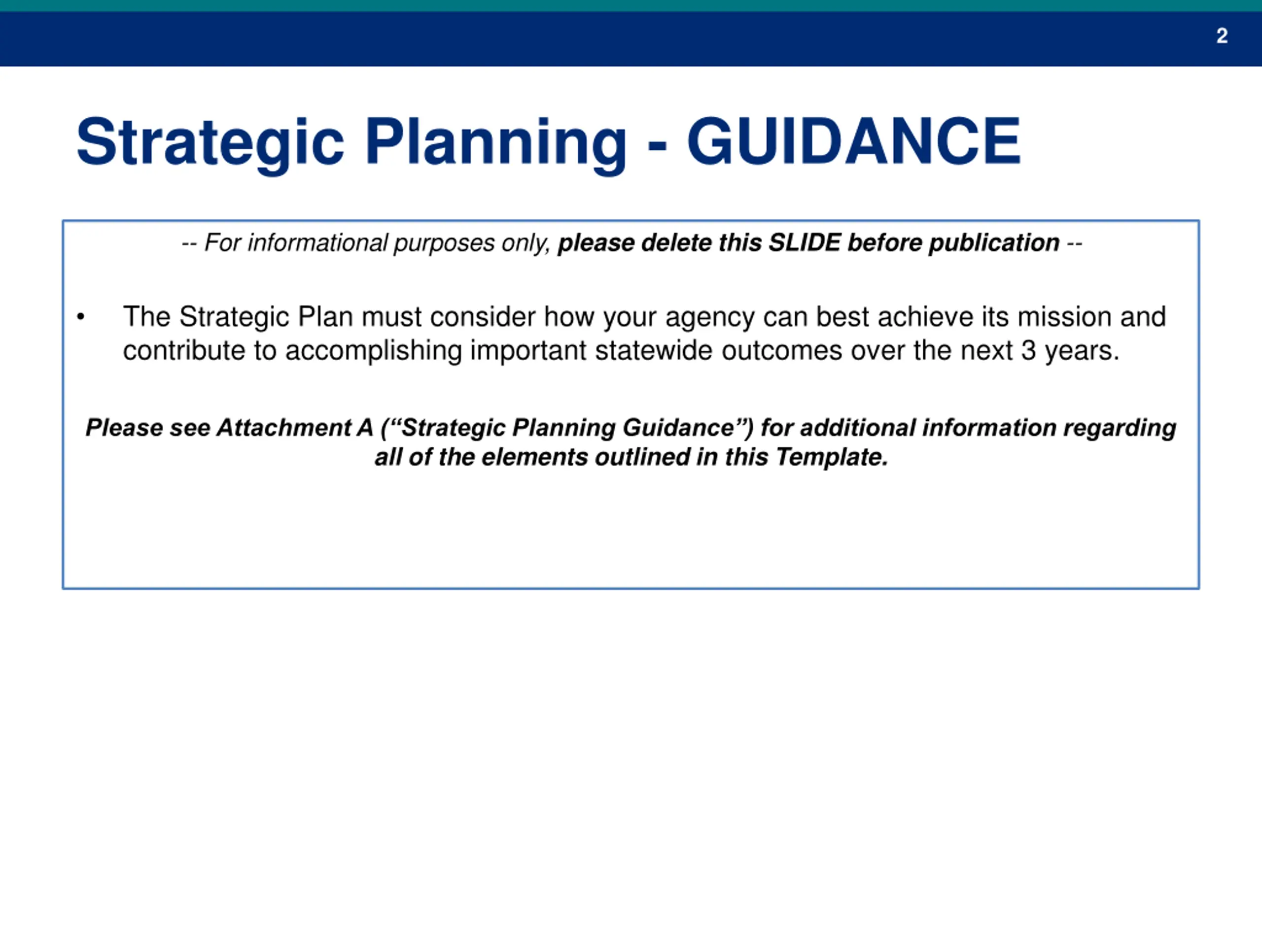 2 Strategic Planning - GUIDANCE -- For informational purposes only, please delete this SLIDE before publication -- The Strategic Plan must consider how your agency can best achieve its mission and contribute to accomplishing important statewide outcomes over the next 3 years. Please see Attachment A ( Strategic Planning Guidance ) for additional information regarding all of the elements outlined in this Template.