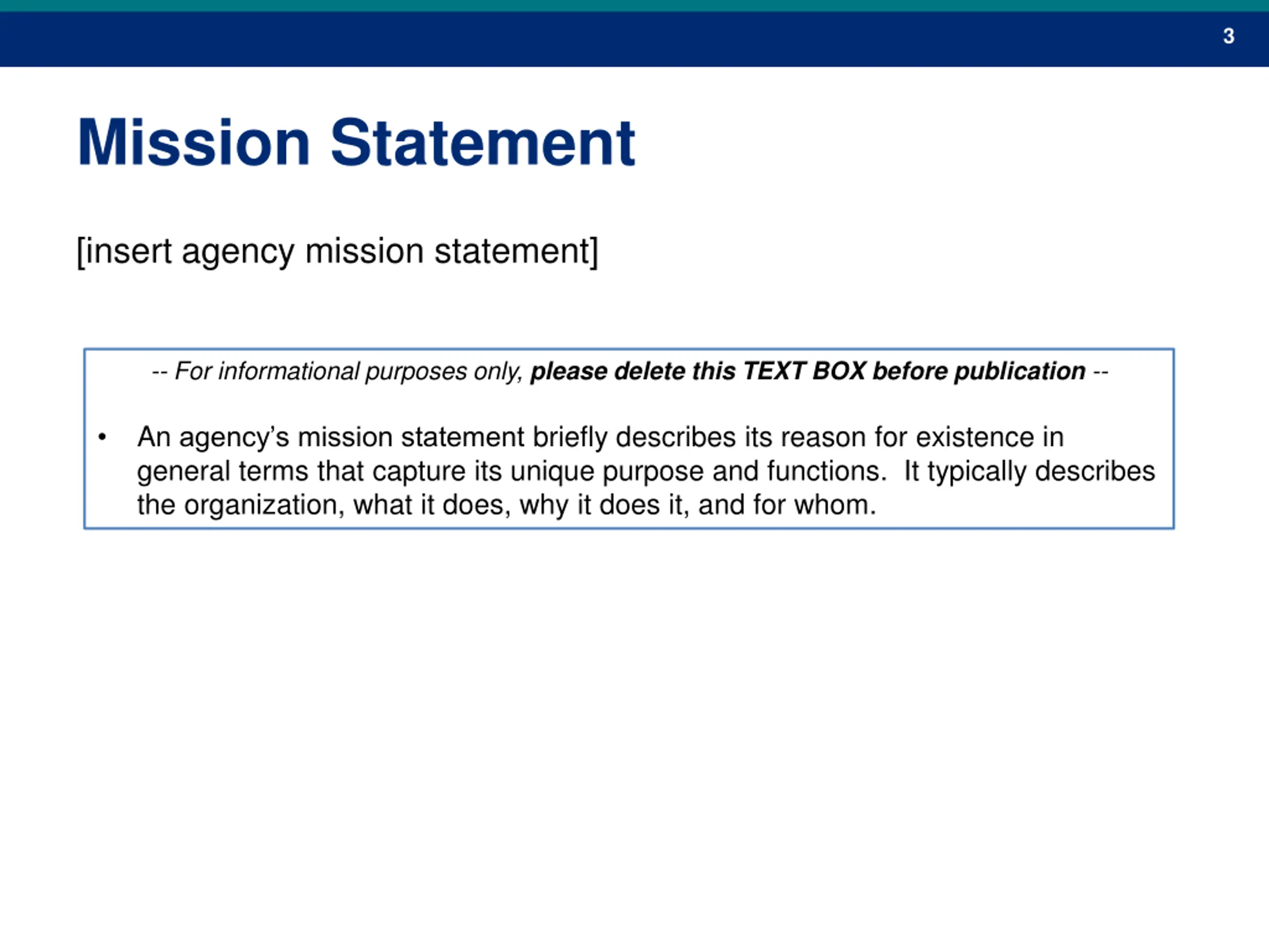 3 Mission Statement [insert agency mission statement] --For informational purposes only, please delete this TEXT BOX before publication -- An agency s mission statement briefly describes its reason for existence in general terms that capture its unique purpose and functions. It typically describes the organization, what it does, why it does it, and for whom.