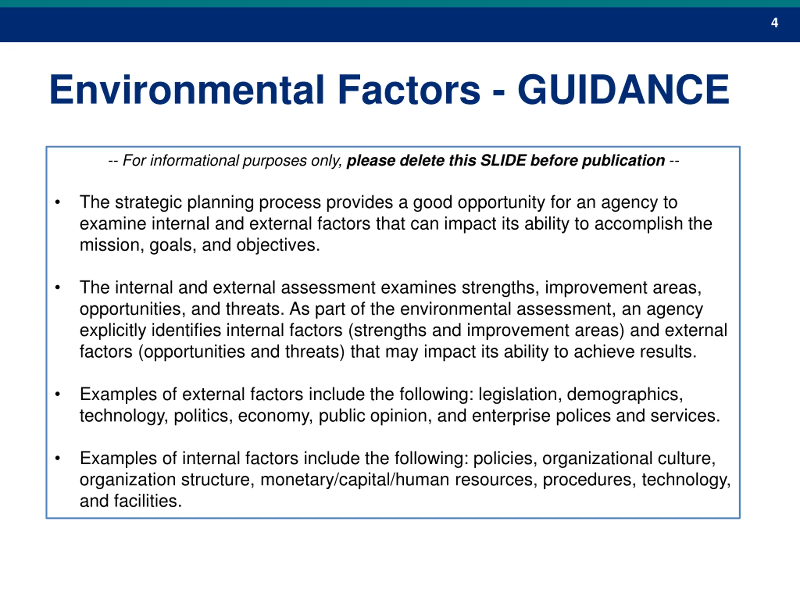4 Environmental Factors - GUIDANCE -- For informational purposes only, please delete this SLIDE before publication -- The strategic planning process provides a good opportunity for an agency to examine internal and external factors that can impact its ability to accomplish the mission, goals, and objectives. The internal and external assessment examines strengths, improvement areas, opportunities, and threats. As part of the environmental assessment, an agency explicitly identifies internal factors (strengths and improvement areas) and external factors (opportunities and threats) that may impact its ability to achieve results. Examples of external factors include the following: legislation, demographics, technology, politics, economy, public opinion, and enterprise polices and services. Examples of internal factors include the following: policies, organizational culture, organization structure, monetary/capital/human resources, procedures, technology, and facilities.