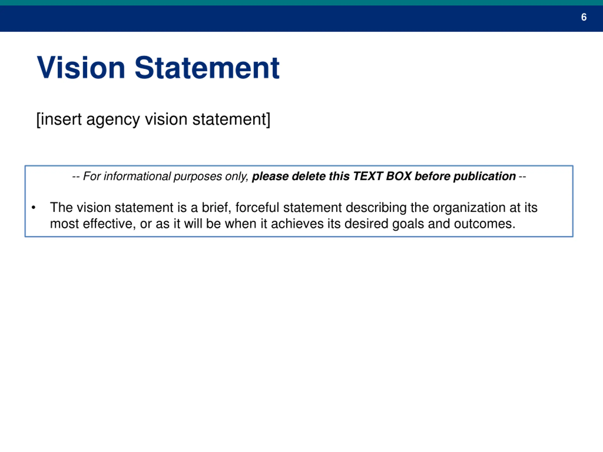 6 Vision Statement [insert agency vision statement] -- For informational purposes only, please delete this TEXT BOX before publication -- The vision statement is a brief, forceful statement describing the organization at its most effective, or as it will be when it achieves its desired goals and outcomes.