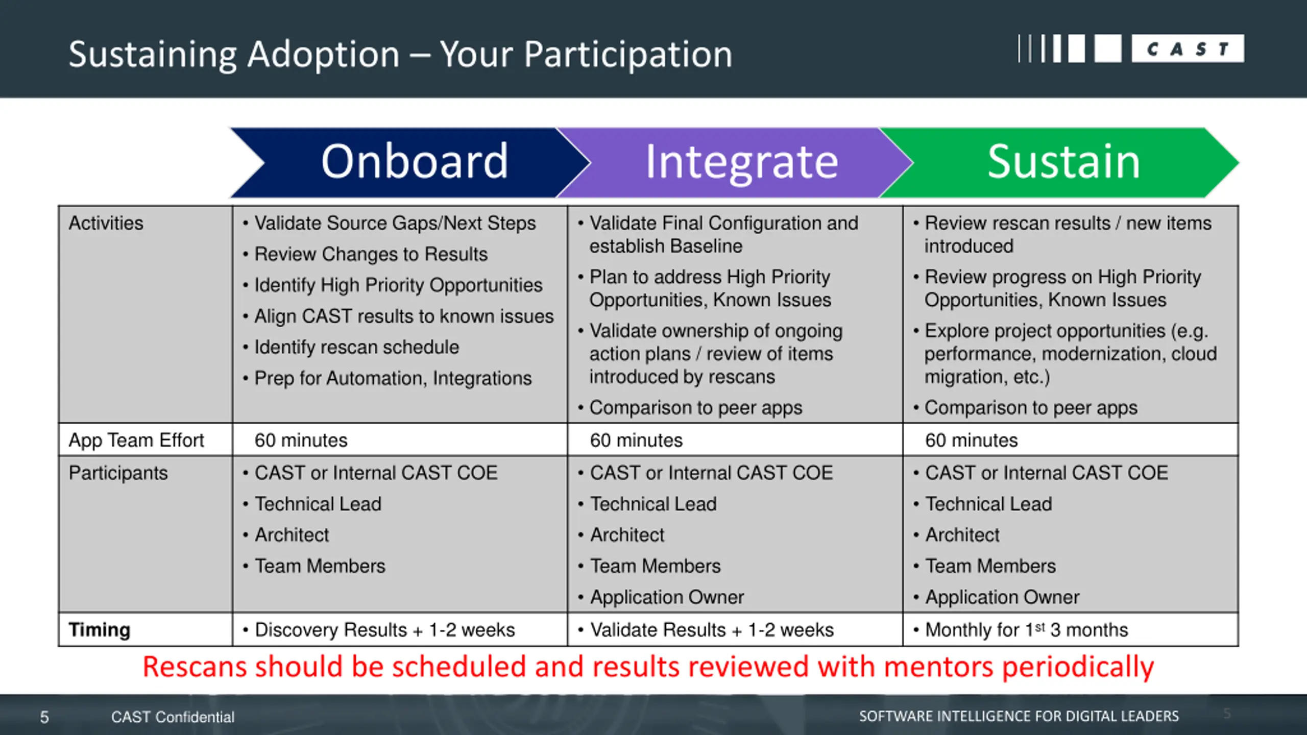Agile Adoption - Overview Initial source delivery, automated analysis, confirm architecture, identify source gaps, preliminary results in CAST Dashboards Discover Close source gaps, detailed configuration, complete initial CAST metrics, identify key opportunities, alignment with known pain points Onboard Fine tuning configuration, automation, integrations, sustainable action plans, peer app comparison Integrate Establish baseline, review rescans (incremental code), validate new issues introduced, track progress against plans Sustain CAST Confidential SOFTWARE INTELLIGENCE FOR DIGITAL LEADERS