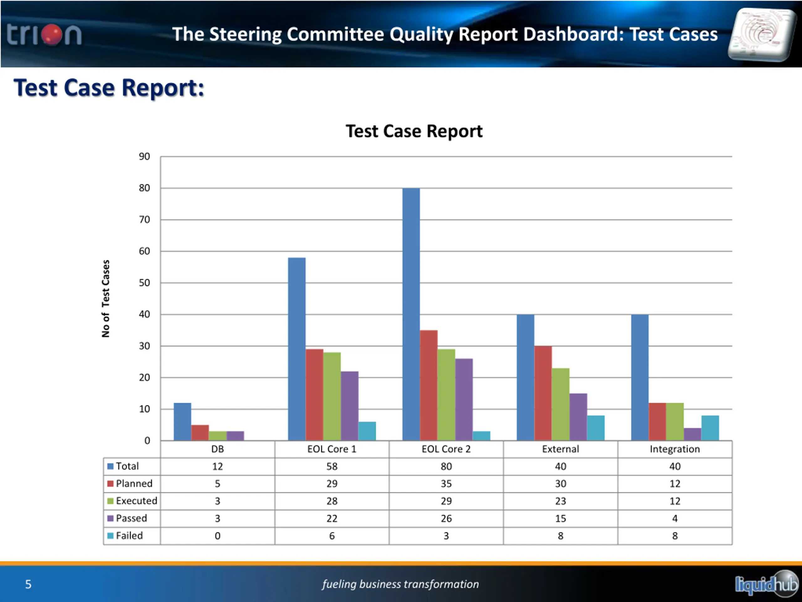 The Steering Committee Quality Report Dashboard: Test Cases Test Case Report: Test Case Report 90 80 70 60 No of Test Cases 50 40 30 20 10 0 DB EOL Core 1 EOL Core 2 External Integration Total 12 58 80 40 40 Planned 5 29 35 30 12 Executed 3 28 29 23 12 Passed 3 22 26 15 4 Failed 0 6 3 8 8 5 fueling business transformation