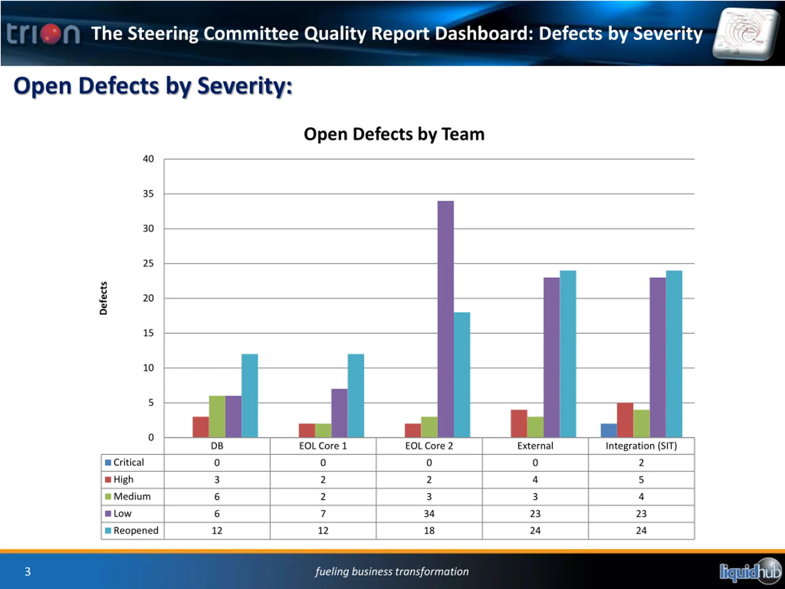 The Steering Committee Quality Report Dashboard: Defects by Severity Open Defects by Severity: Open Defects by Team 40 35 30 25 Defects 20 15 10 5 0 DB EOL Core 1 EOL Core 2 External Integration (SIT) Critical 0 0 0 0 2 High 3 2 2 4 5 Medium 6 2 3 3 4 Low 6 7 34 23 23 Reopened 12 12 18 24 24 3 fueling business transformation
