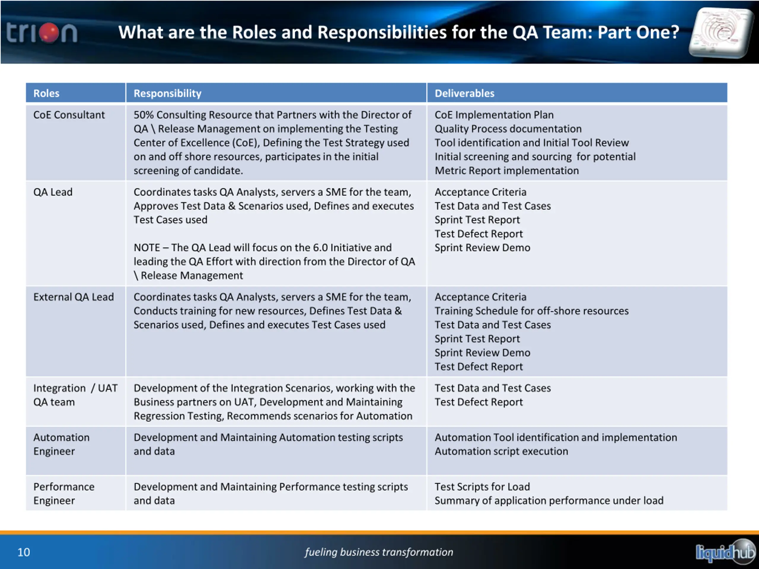 What are the Roles and Responsibilities for the QA Team: Part One? Roles Responsibility Deliverables CoE Consultant 50% Consulting Resource that Partners with the Director of QA \ Release Management on implementing the Testing Center of Excellence (CoE), Defining the Test Strategy used on and off shore resources, participates in the initial screening of candidate. CoE Implementation Plan Quality Process documentation Tool identification and Initial Tool Review Initial screening and sourcing for potential Metric Report implementation QA Lead Coordinates tasks QA Analysts, servers a SME for the team, Approves Test Data & Scenarios used, Defines and executes Test Cases used Acceptance Criteria Test Data and Test Cases Sprint Test Report Test Defect Report Sprint Review Demo NOTE The QA Lead will focus on the 6.0 Initiative and leading the QA Effort with direction from the Director of QA \ Release Management External QA Lead Coordinates tasks QA Analysts, servers a SME for the team, Conducts training for new resources, Defines Test Data & Scenarios used, Defines and executes Test Cases used Acceptance Criteria Training Schedule for off-shore resources Test Data and Test Cases Sprint Test Report Sprint Review Demo Test Defect Report Integration / UAT QA team Development of the Integration Scenarios, working with the Business partners on UAT, Development and Maintaining Regression Testing, Recommends scenarios for Automation Test Data and Test Cases Test Defect Report Automation Engineer Development and Maintaining Automation testing scripts and data Automation Tool identification and implementation Automation script execution Performance Engineer Development and Maintaining Performance testing scripts and data Test Scripts for Load Summary of application performance under load 10 fueling business transformation