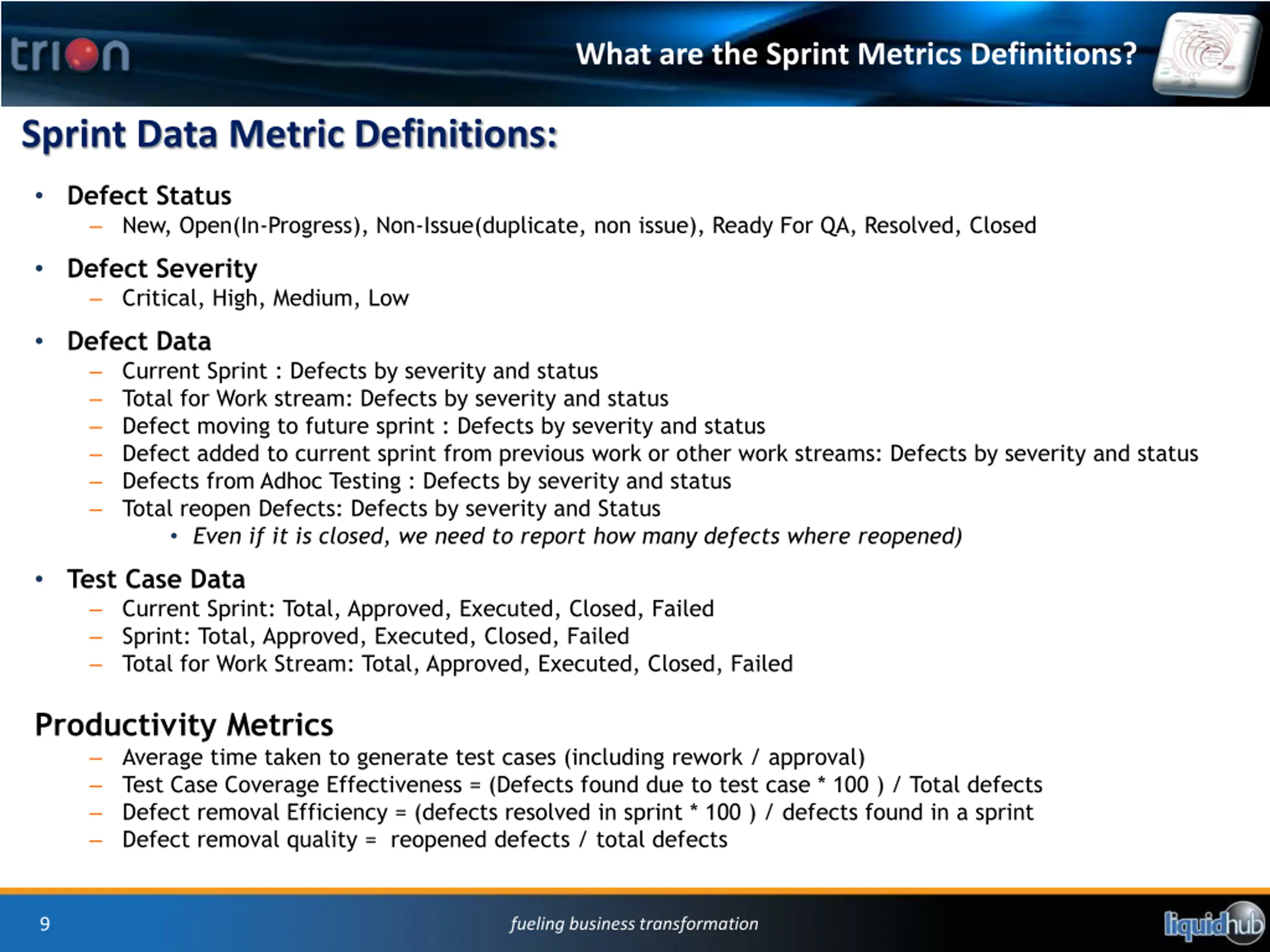 What are the Sprint Metrics Definitions? Sprint Data Metric Definitions: Defect Status New, Open(In-Progress), Non-Issue(duplicate, non issue), Ready For QA, Resolved, Closed Defect Severity Critical, High, Medium, Low Defect Data Current Sprint : Defects by severity and status Total for Work stream: Defects by severity and status Defect moving to future sprint : Defects by severity and status Defect added to current sprint from previous work or other work streams: Defects by severity and status Defects from Adhoc Testing : Defects by severity and status Total reopen Defects: Defects by severity and Status Even if it is closed, we need to report how many defects where reopened) Test Case Data Current Sprint: Total, Approved, Executed, Closed, Failed Sprint: Total, Approved, Executed, Closed, Failed Total for Work Stream: Total, Approved, Executed, Closed, Failed Productivity Metrics Average time taken to generate test cases (including rework / approval) Test Case Coverage Effectiveness = (Defects found due to test case * 100 ) / Total defects Defect removal Efficiency = (defects resolved in sprint * 100 ) / defects found in a sprint Defect removal quality = reopened defects / total defects 9 fueling business transformation