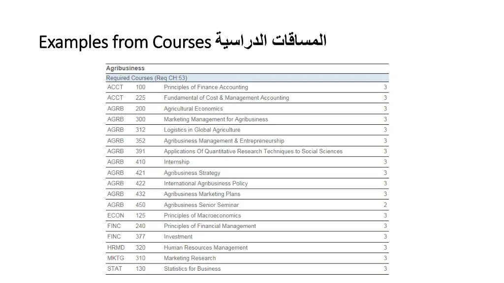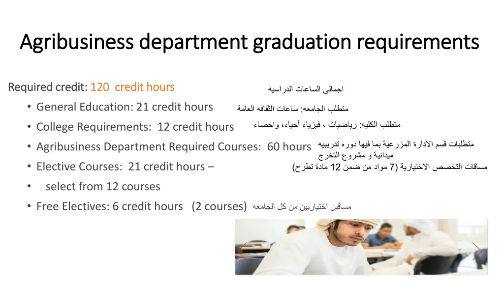 Agribusiness department graduation requirements Agribusiness department graduation requirements Required credit: Required credit: 120 General Education: 21 credit hours College Requirements: 12 credit hours Agribusiness Department Required Courses: 60 hours Elective Courses: 21 credit hours select from 12 courses Free Electives: 6 credit hours (2 courses) 120 credit hours credit hours : : ( 7 12 )
