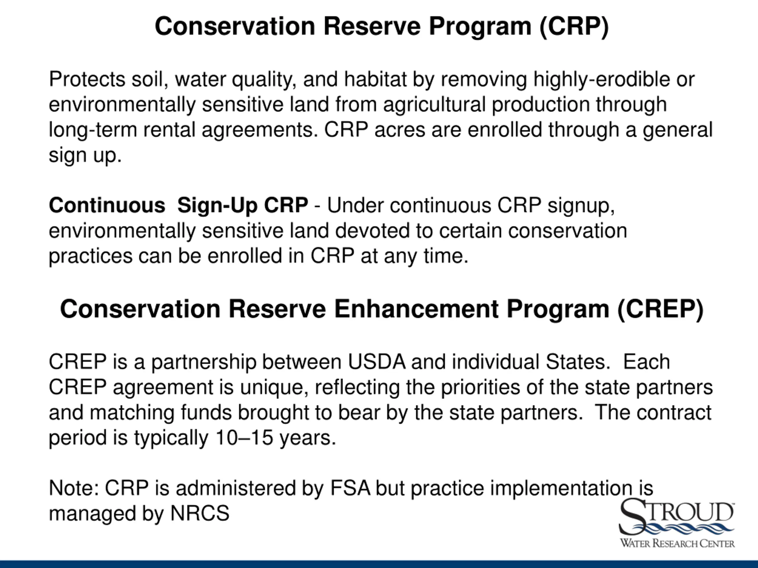 Conservation Reserve Program (CRP) Protects soil, water quality, and habitat by removing highly-erodible or environmentally sensitive land from agricultural production through long-term rental agreements. CRP acres are enrolled through a general sign up. Continuous Sign-Up CRP - Under continuous CRP signup, environmentally sensitive land devoted to certain conservation practices can be enrolled in CRP at any time. Conservation Reserve Enhancement Program (CREP) CREP is a partnership between USDA and individual States. Each CREP agreement is unique, reflecting the priorities of the state partners and matching funds brought to bear by the state partners. The contract period is typically 10 15 years. Photo: Marissa Morton Note: CRP is administered by FSA but practice implementation is managed by NRCS