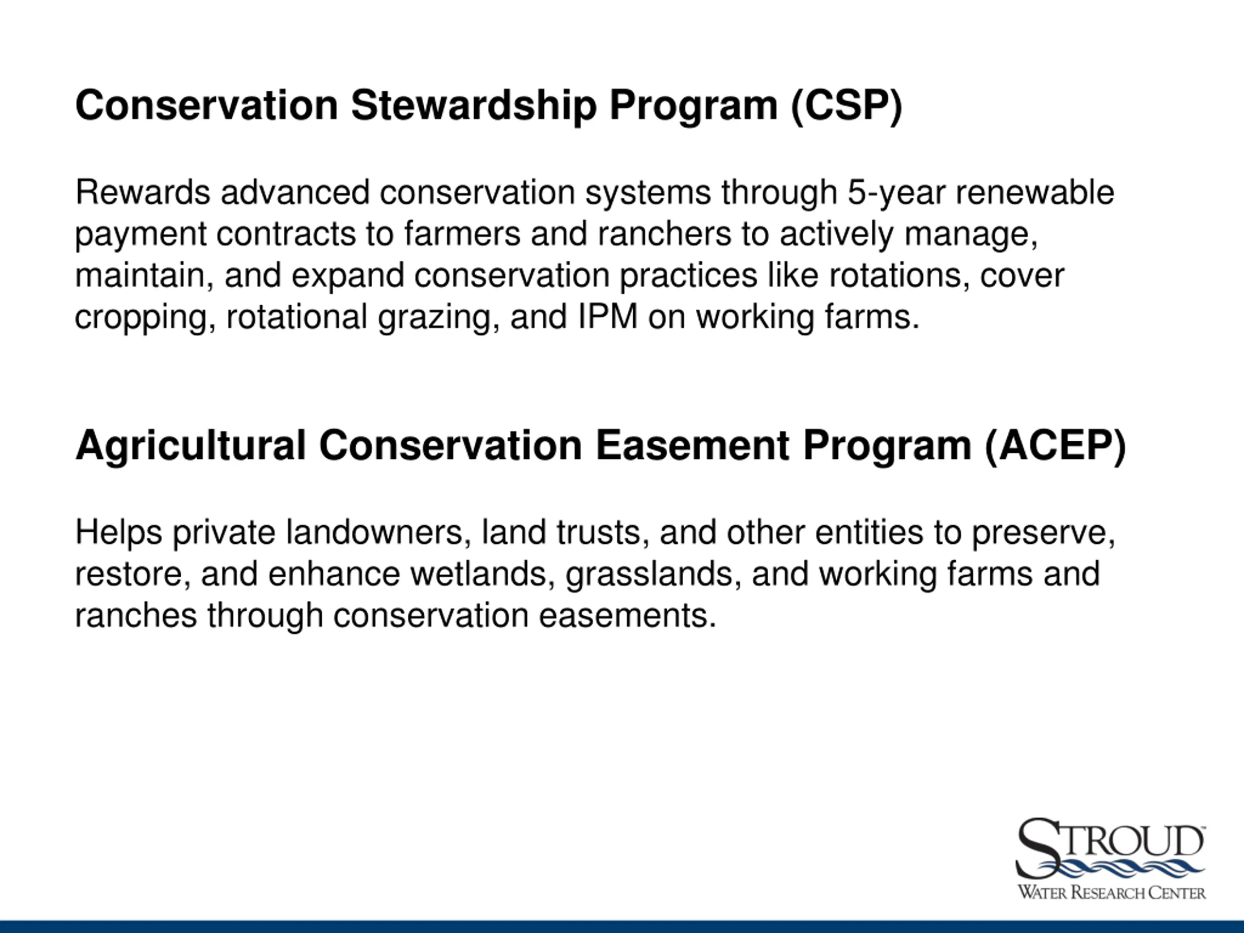 Conservation Stewardship Program (CSP) Rewards advanced conservation systems through 5-year renewable payment contracts to farmers and ranchers to actively manage, maintain, and expand conservation practices like rotations, cover cropping, rotational grazing, and IPM on working farms. Agricultural Conservation Easement Program (ACEP) Helps private landowners, land trusts, and other entities to preserve, restore, and enhance wetlands, grasslands, and working farms and ranches through conservation easements. Photo: Marissa Morton