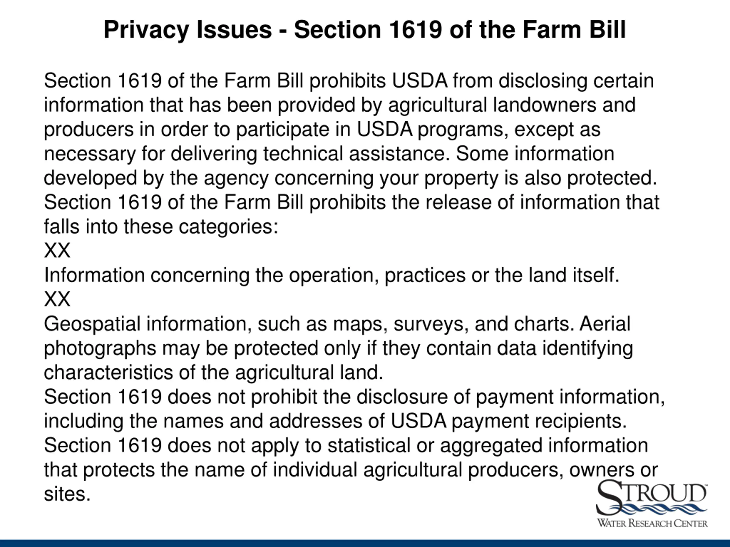Privacy Issues - Section 1619 of the Farm Bill Section 1619 of the Farm Bill prohibits USDA from disclosing certain information that has been provided by agricultural landowners and producers in order to participate in USDA programs, except as necessary for delivering technical assistance. Some information developed by the agency concerning your property is also protected. Section 1619 of the Farm Bill prohibits the release of information that falls into these categories: XX Information concerning the operation, practices or the land itself. XX Geospatial information, such as maps, surveys, and charts. Aerial photographs may be protected only if they contain data identifying characteristics of the agricultural land. Section 1619 does not prohibit the disclosure of payment information, including the names and addresses of USDA payment recipients. Section 1619 does not apply to statistical or aggregated information that protects the name of individual agricultural producers, owners or sites. Photo: Marissa Morton