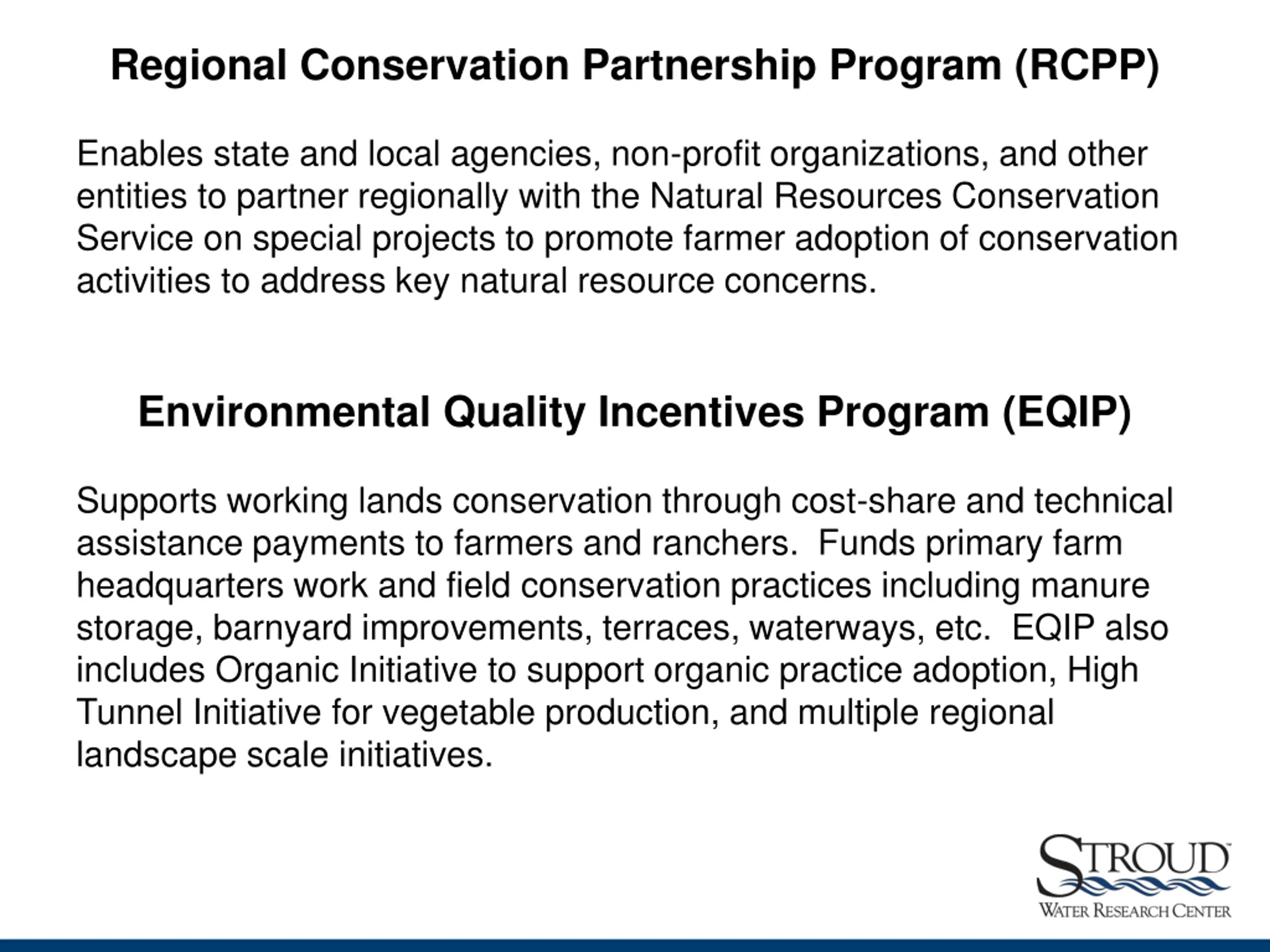 Regional Conservation Partnership Program (RCPP) Enables state and local agencies, non-profit organizations, and other entities to partner regionally with the Natural Resources Conservation Service on special projects to promote farmer adoption of conservation activities to address key natural resource concerns. Environmental Quality Incentives Program (EQIP) Supports working lands conservation through cost-share and technical assistance payments to farmers and ranchers. Funds primary farm headquarters work and field conservation practices including manure storage, barnyard improvements, terraces, waterways, etc. EQIP also includes Organic Initiative to support organic practice adoption, High Tunnel Initiative for vegetable production, and multiple regional landscape scale initiatives. Photo: Marissa Morton