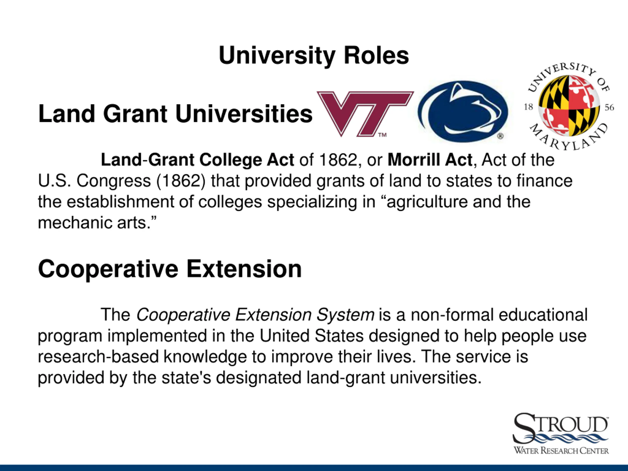 University Roles Land Grant Universities U.S. Congress (1862) that provided grants of land to states to finance the establishment of colleges specializing in agriculture and the mechanic arts. Land-Grant College Act of 1862, or Morrill Act, Act of the Cooperative Extension Photo: Marissa Morton program implemented in the United States designed to help people use research-based knowledge to improve their lives. The service is provided by the state's designated land-grant universities. The Cooperative Extension System is a non-formal educational