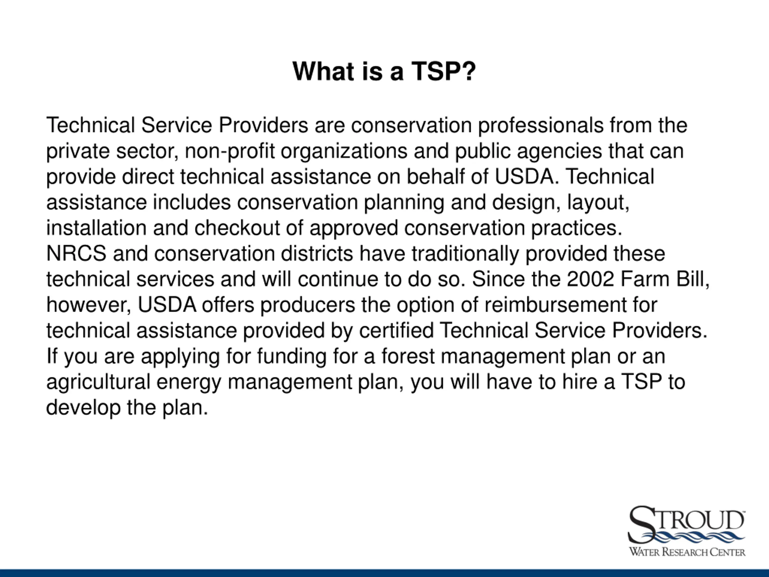 What is a TSP? Technical Service Providers are conservation professionals from the private sector, non-profit organizations and public agencies that can provide direct technical assistance on behalf of USDA. Technical assistance includes conservation planning and design, layout, installation and checkout of approved conservation practices. NRCS and conservation districts have traditionally provided these technical services and will continue to do so. Since the 2002 Farm Bill, however, USDA offers producers the option of reimbursement for technical assistance provided by certified Technical Service Providers. If you are applying for funding for a forest management plan or an agricultural energy management plan, you will have to hire a TSP to develop the plan. Photo: Marissa Morton