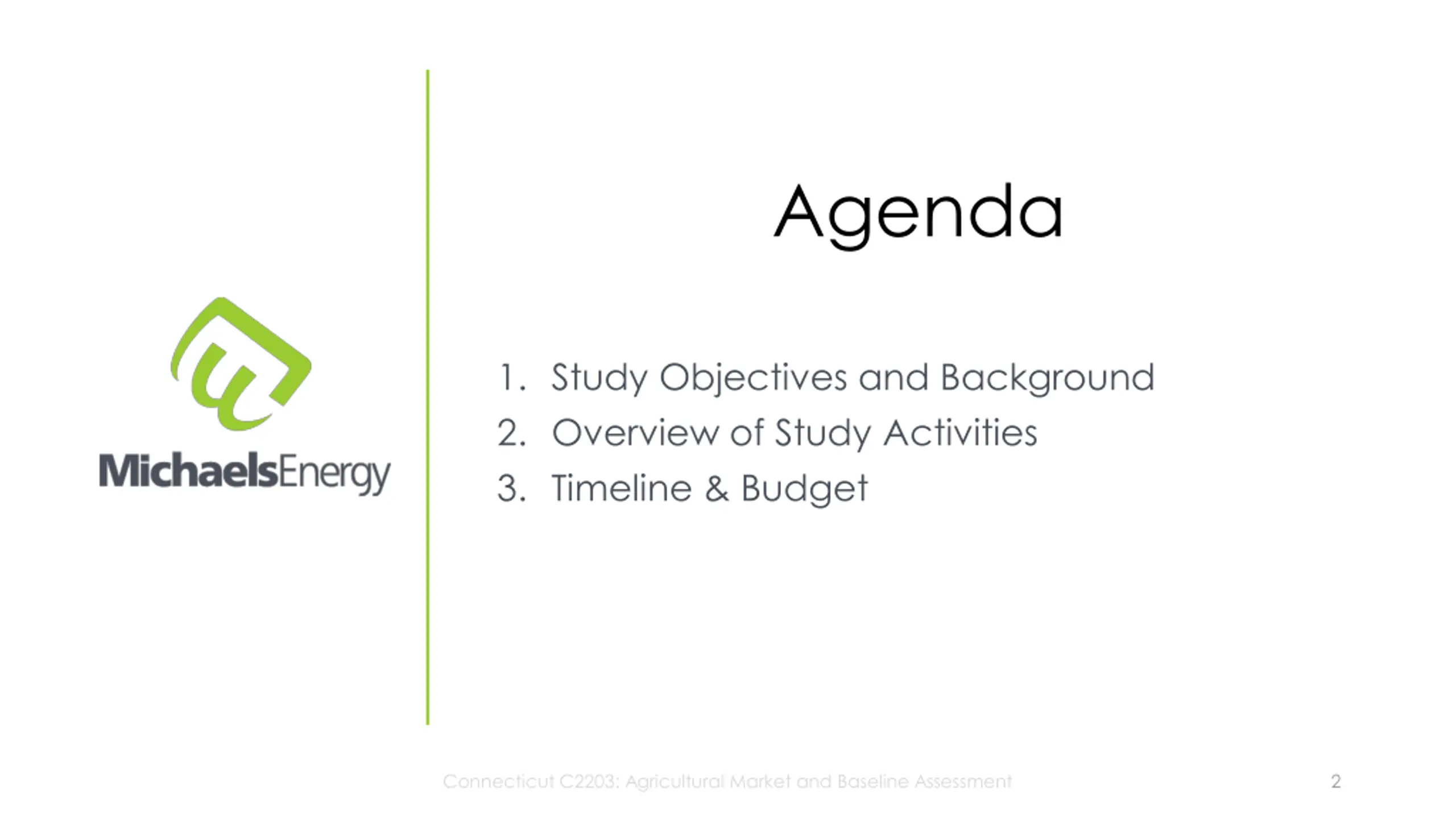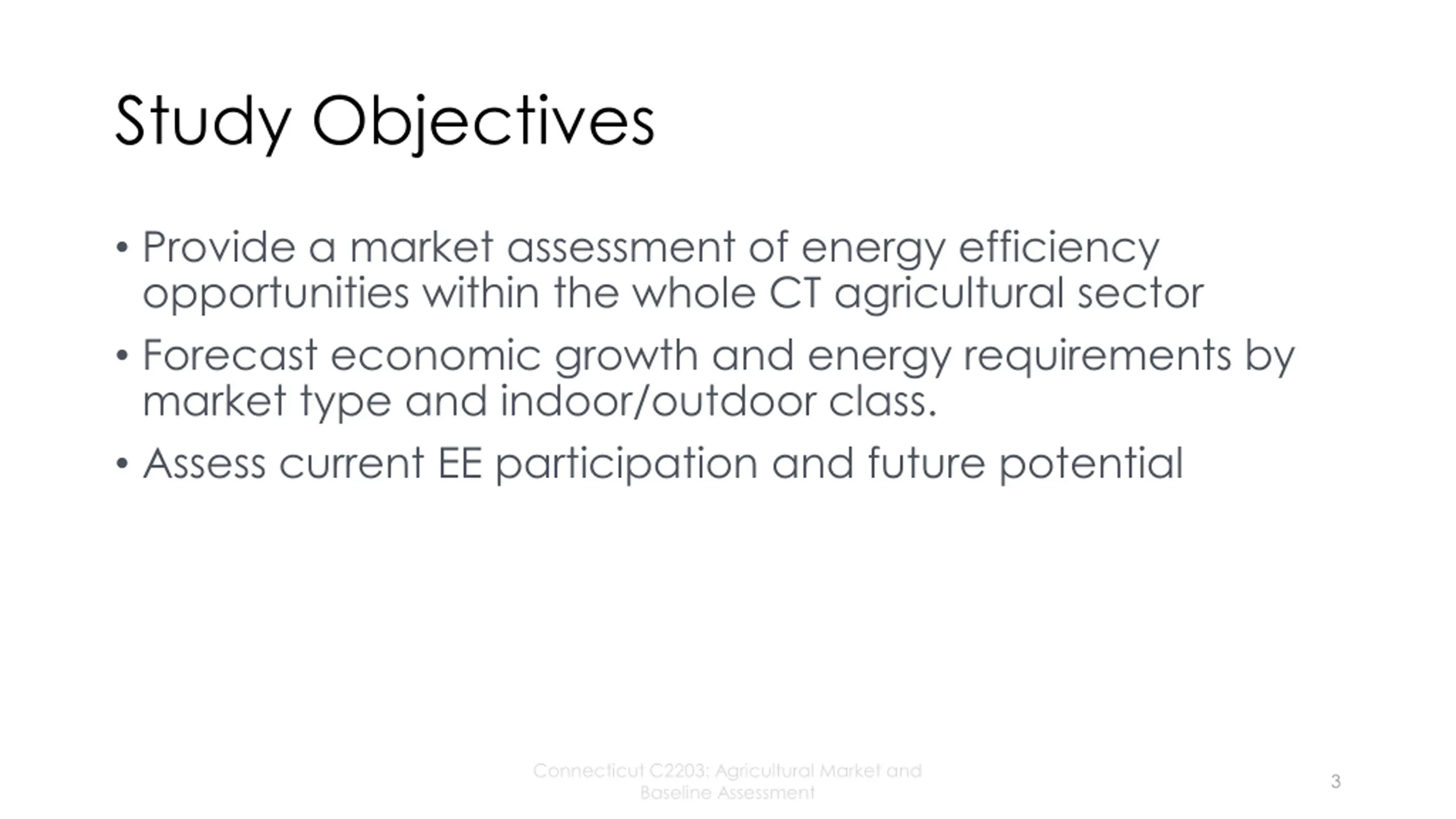 Agenda 1. Study Objectives and Background 2. Overview of Study Activities 3. Timeline & Budget Connecticut C2203: Agricultural Market and Baseline Assessment 2
