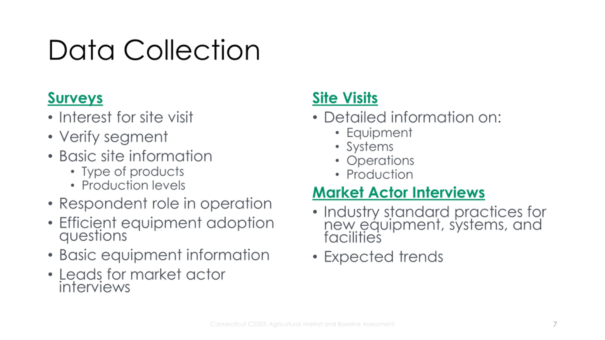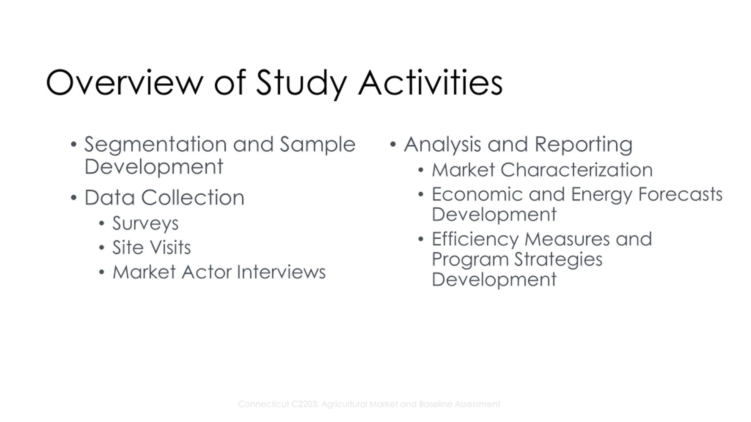Overview of Study Activities Segmentation and Sample Development Data Collection Surveys Site Visits Market Actor Interviews Analysis and Reporting Market Characterization Economic and Energy Forecasts Development Efficiency Measures and Program Strategies Development Connecticut C2203: Agricultural Market and Baseline Assessment