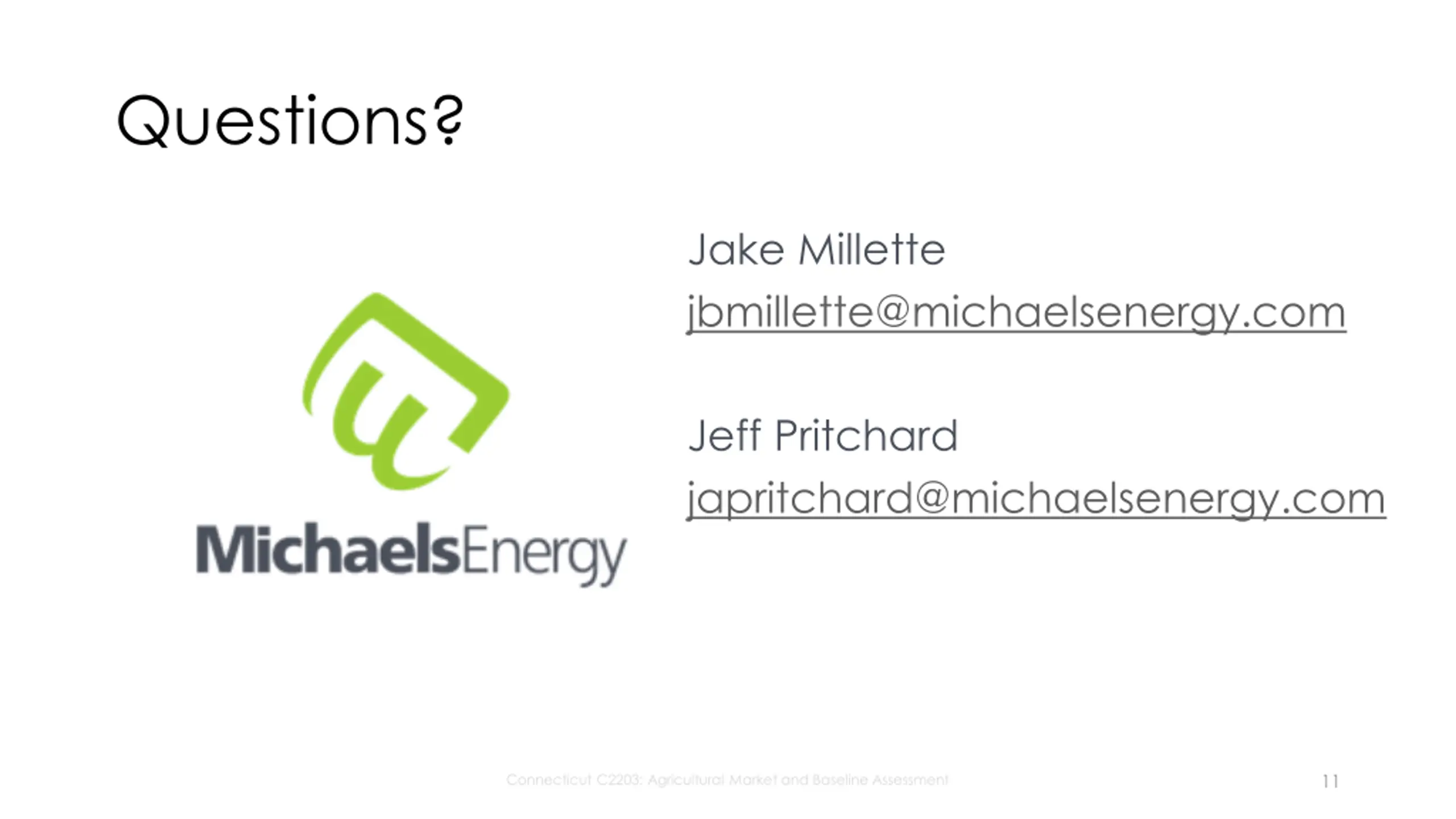 Questions? Jake Millette jbmillette@michaelsenergy.com Jeff Pritchard japritchard@michaelsenergy.com 11 Connecticut C2203: Agricultural Market and Baseline Assessment