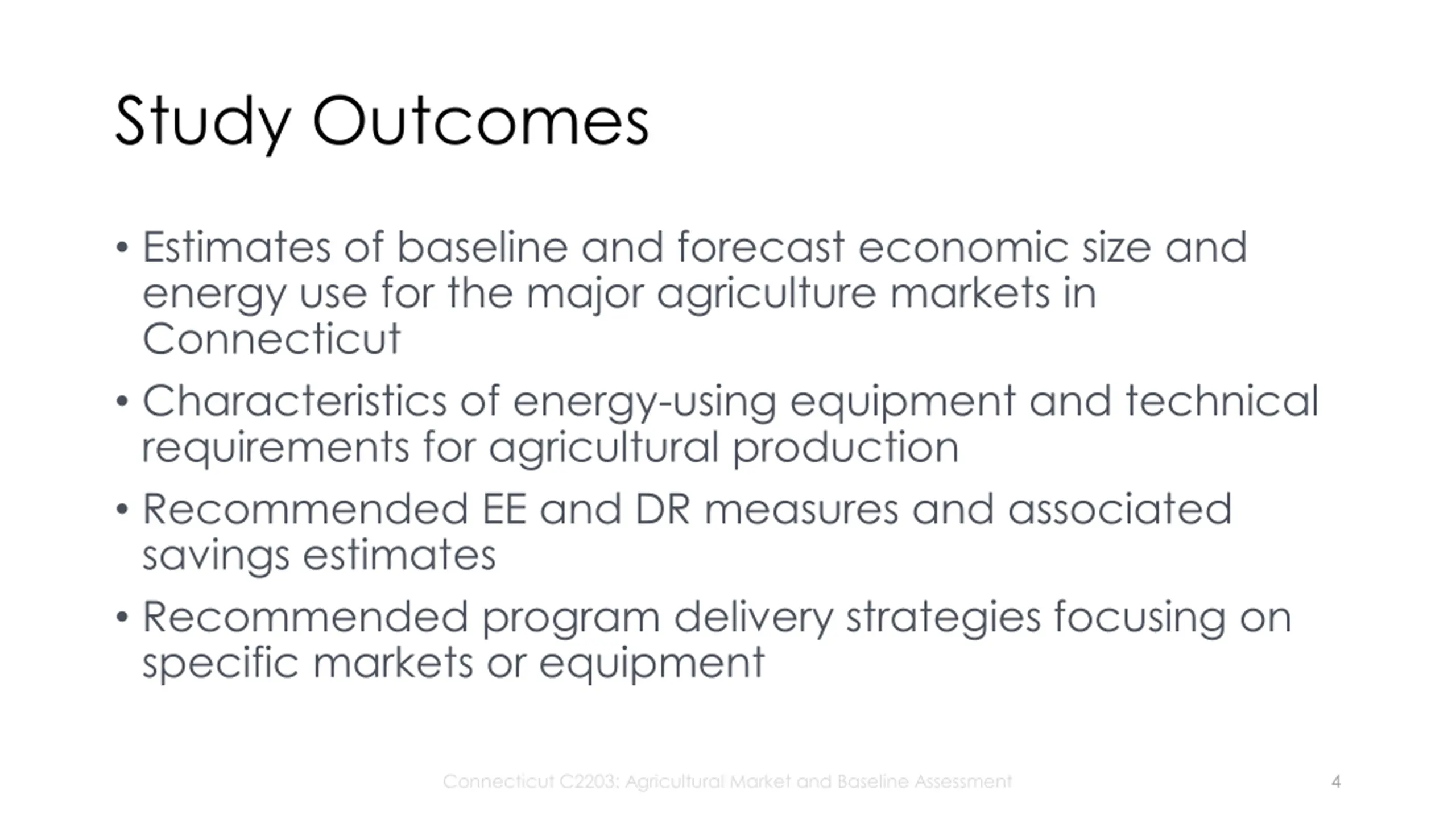 Study Objectives Provide a market assessment of energy efficiency opportunities within the whole CT agricultural sector Forecast economic growth and energy requirements by market type and indoor/outdoor class. Assess current EE participation and future potential Connecticut C2203: Agricultural Market and Baseline Assessment 3