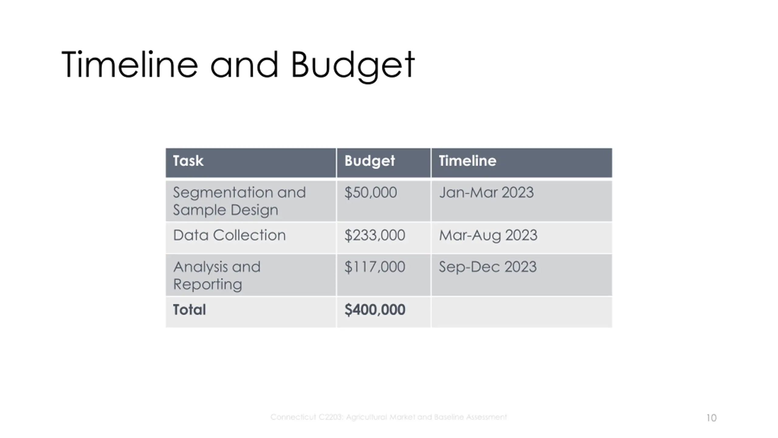 Timeline and Budget Task Budget Timeline Segmentation and Sample Design Data Collection $50,000 Jan-Mar 2023 $233,000 Mar-Aug 2023 Analysis and Reporting Total $117,000 Sep-Dec 2023 $400,000 10 Connecticut C2203: Agricultural Market and Baseline Assessment