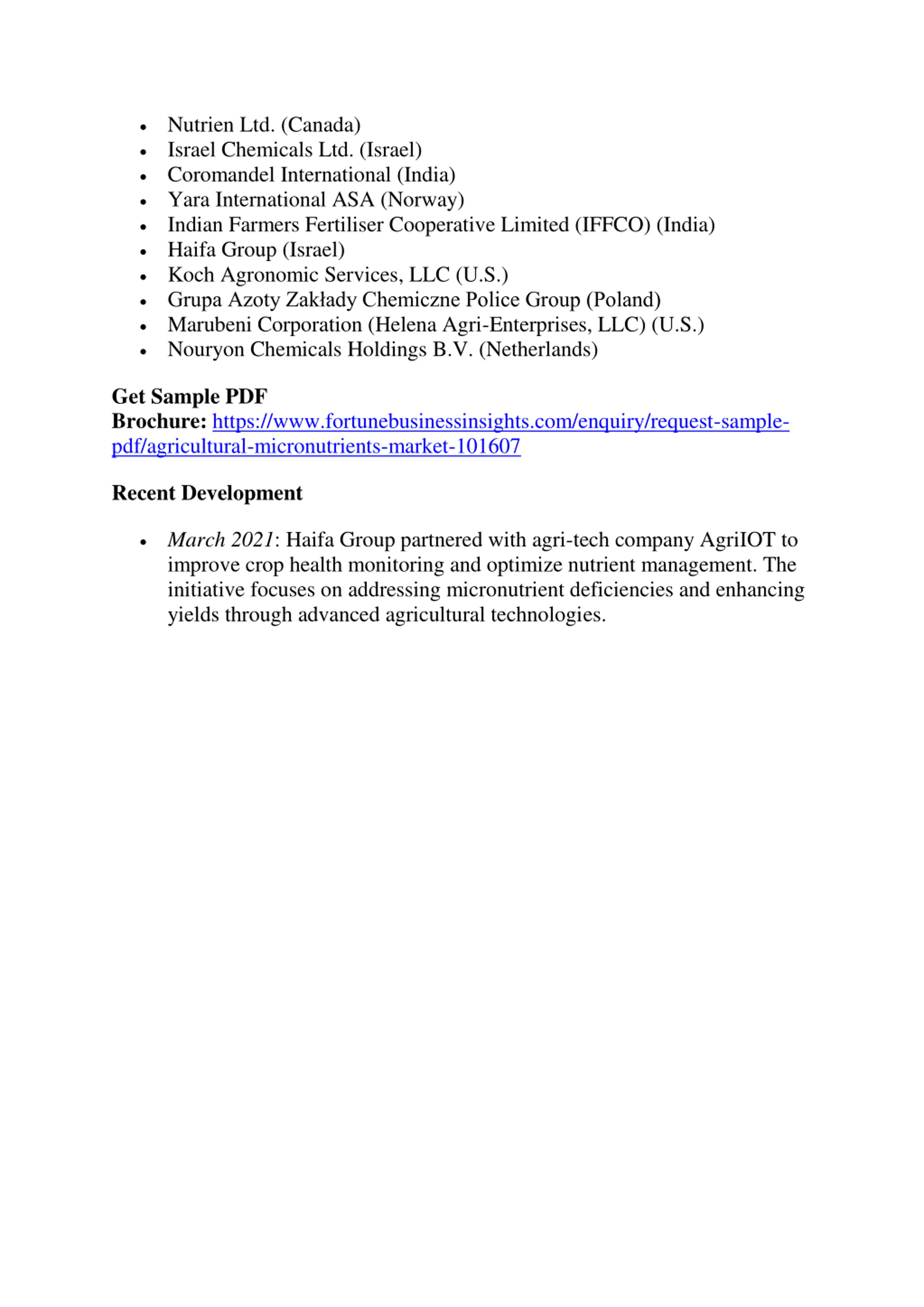 Nutrien Ltd. (Canada) Israel Chemicals Ltd. (Israel) Coromandel International (India) Yara International ASA (Norway) Indian Farmers Fertiliser Cooperative Limited (IFFCO) (India) Haifa Group (Israel) Koch Agronomic Services, LLC (U.S.) Grupa Azoty Zak ady Chemiczne Police Group (Poland) Marubeni Corporation (Helena Agri-Enterprises, LLC) (U.S.) Nouryon Chemicals Holdings B.V. (Netherlands) Get Sample PDF Brochure: https://www.fortunebusinessinsights.com/enquiry/request-sample- pdf/agricultural-micronutrients-market-101607 Recent Development March 2021: Haifa Group partnered with agri-tech company AgriIOT to improve crop health monitoring and optimize nutrient management. The initiative focuses on addressing micronutrient deficiencies and enhancing yields through advanced agricultural technologies.