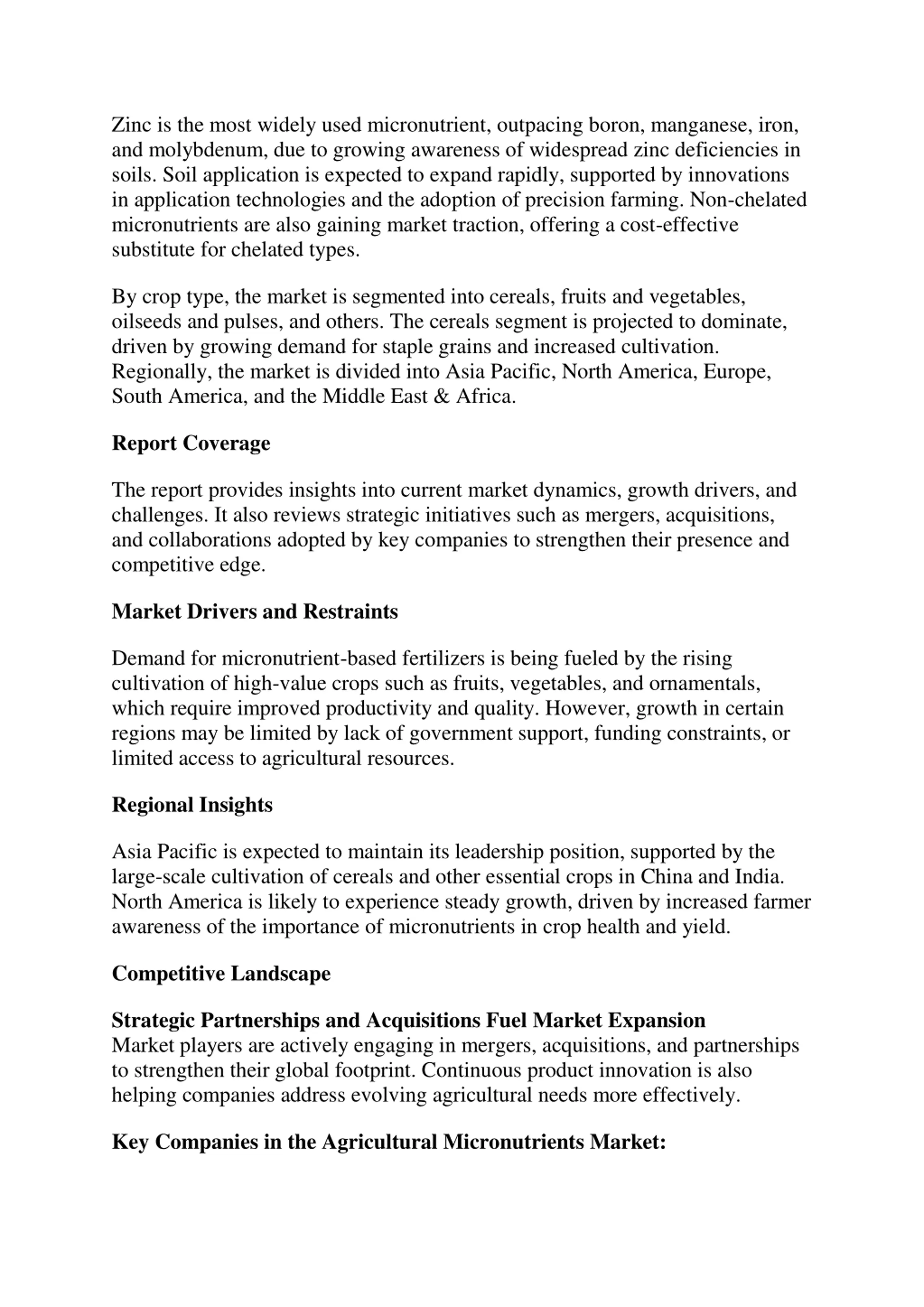 Zinc is the most widely used micronutrient, outpacing boron, manganese, iron, and molybdenum, due to growing awareness of widespread zinc deficiencies in soils. Soil application is expected to expand rapidly, supported by innovations in application technologies and the adoption of precision farming. Non-chelated micronutrients are also gaining market traction, offering a cost-effective substitute for chelated types. By crop type, the market is segmented into cereals, fruits and vegetables, oilseeds and pulses, and others. The cereals segment is projected to dominate, driven by growing demand for staple grains and increased cultivation. Regionally, the market is divided into Asia Pacific, North America, Europe, South America, and the Middle East & Africa. Report Coverage The report provides insights into current market dynamics, growth drivers, and challenges. It also reviews strategic initiatives such as mergers, acquisitions, and collaborations adopted by key companies to strengthen their presence and competitive edge. Market Drivers and Restraints Demand for micronutrient-based fertilizers is being fueled by the rising cultivation of high-value crops such as fruits, vegetables, and ornamentals, which require improved productivity and quality. However, growth in certain regions may be limited by lack of government support, funding constraints, or limited access to agricultural resources. Regional Insights Asia Pacific is expected to maintain its leadership position, supported by the large-scale cultivation of cereals and other essential crops in China and India. North America is likely to experience steady growth, driven by increased farmer awareness of the importance of micronutrients in crop health and yield. Competitive Landscape Strategic Partnerships and Acquisitions Fuel Market Expansion Market players are actively engaging in mergers, acquisitions, and partnerships to strengthen their global footprint. Continuous product innovation is also helping companies address evolving agricultural needs more effectively. Key Companies in the Agricultural Micronutrients Market: