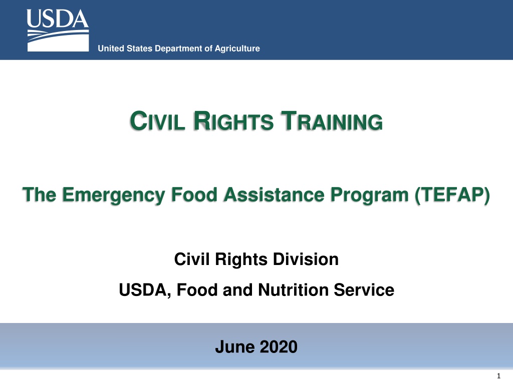 United States Department of Agriculture CIVIL RIGHTS TRAINING The Emergency Food Assistance Program (TEFAP) Civil Rights Division USDA, Food and Nutrition Service June 2020 1