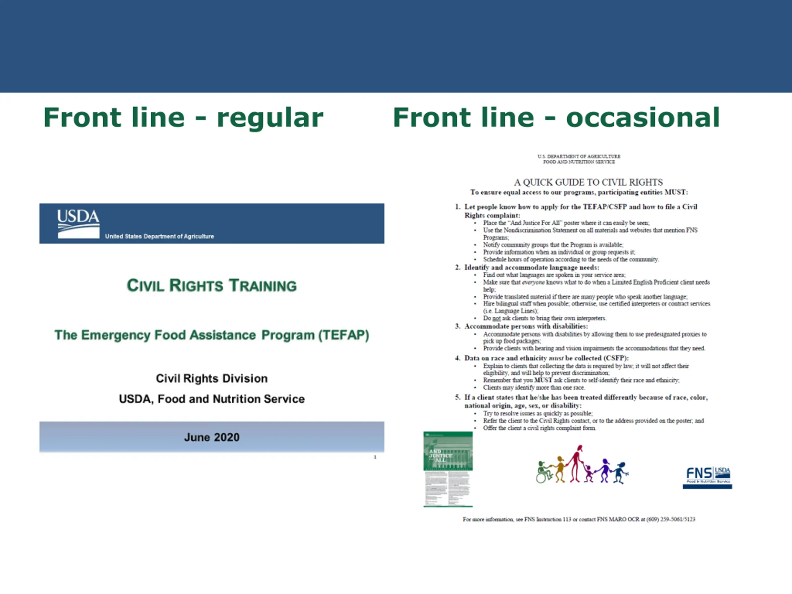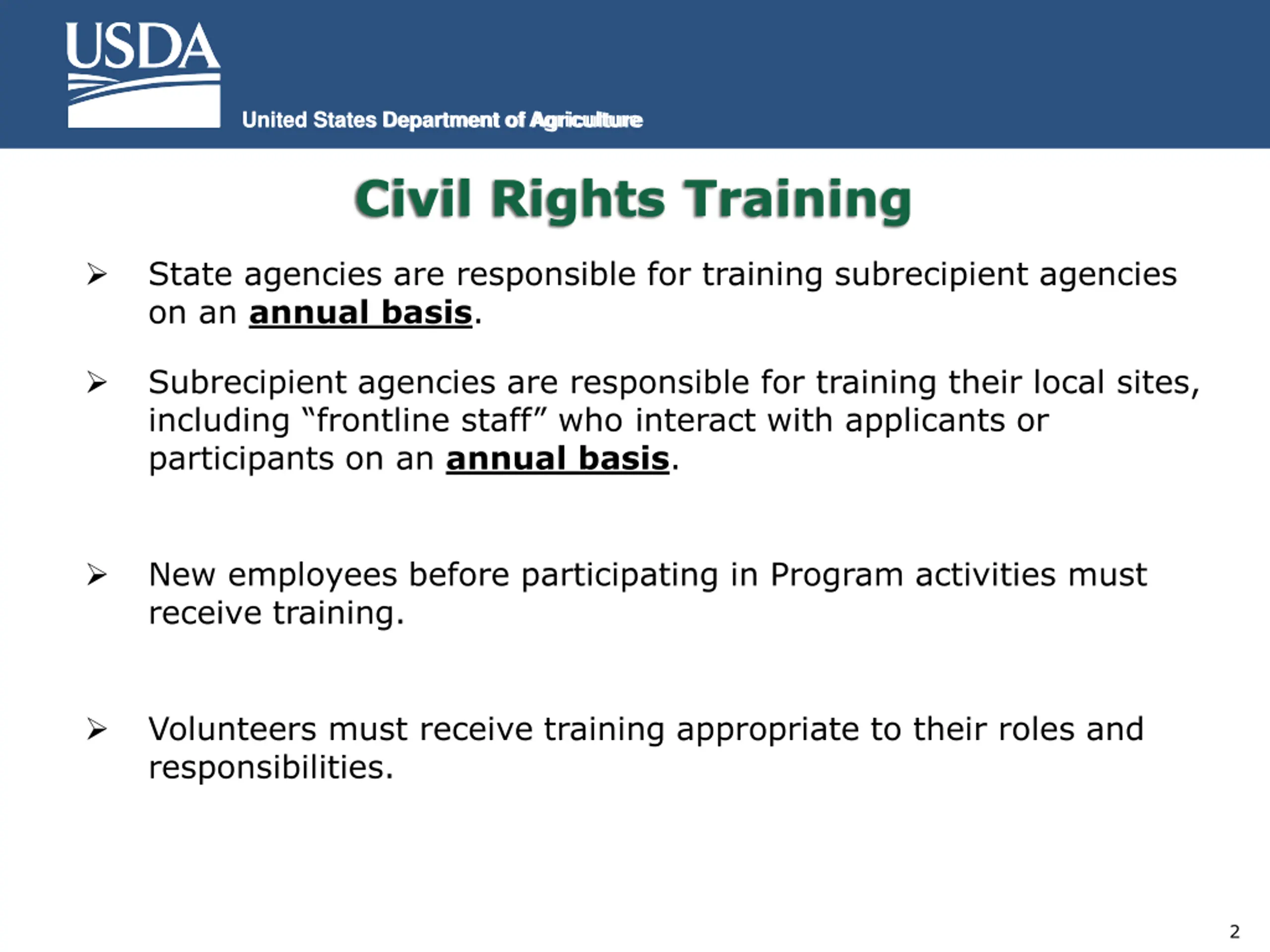 United States Department of Agriculture United States Department of Agriculture Civil Rights Training State agencies are responsible for training subrecipient agencies on an annual basis. Subrecipient agencies are responsible for training their local sites, including frontline staff who interact with applicants or participants on an annual basis. New employees before participating in Program activities must receive training. Volunteers must receive training appropriate to their roles and responsibilities. 2