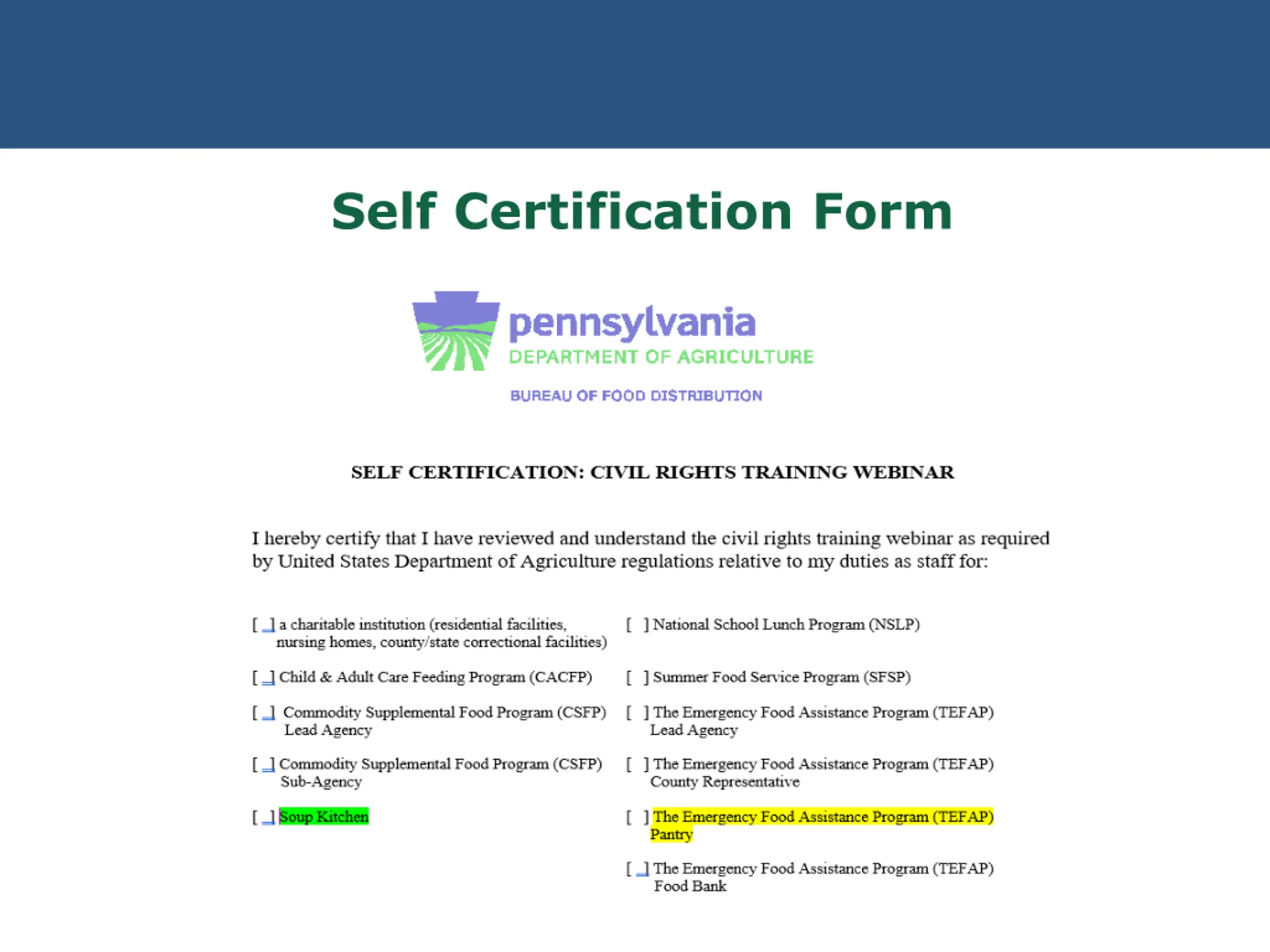 United States Department of Agriculture Assurances To qualify for Federal financial assistance, an application must be accompanied by a written assurance that the entity to receive financial assistance will be operated in compliance with all nondiscrimination laws, regulations, instructions, policies, and guidelines. A Civil Rights assurance statement must be incorporated in all agreements between Federal and CSFP/TEFAP State agencies (FNS Form 74) CSFP/TEFAP State agencies and subrecipient agencies Subrecipient agencies and their local sites (if applicable)