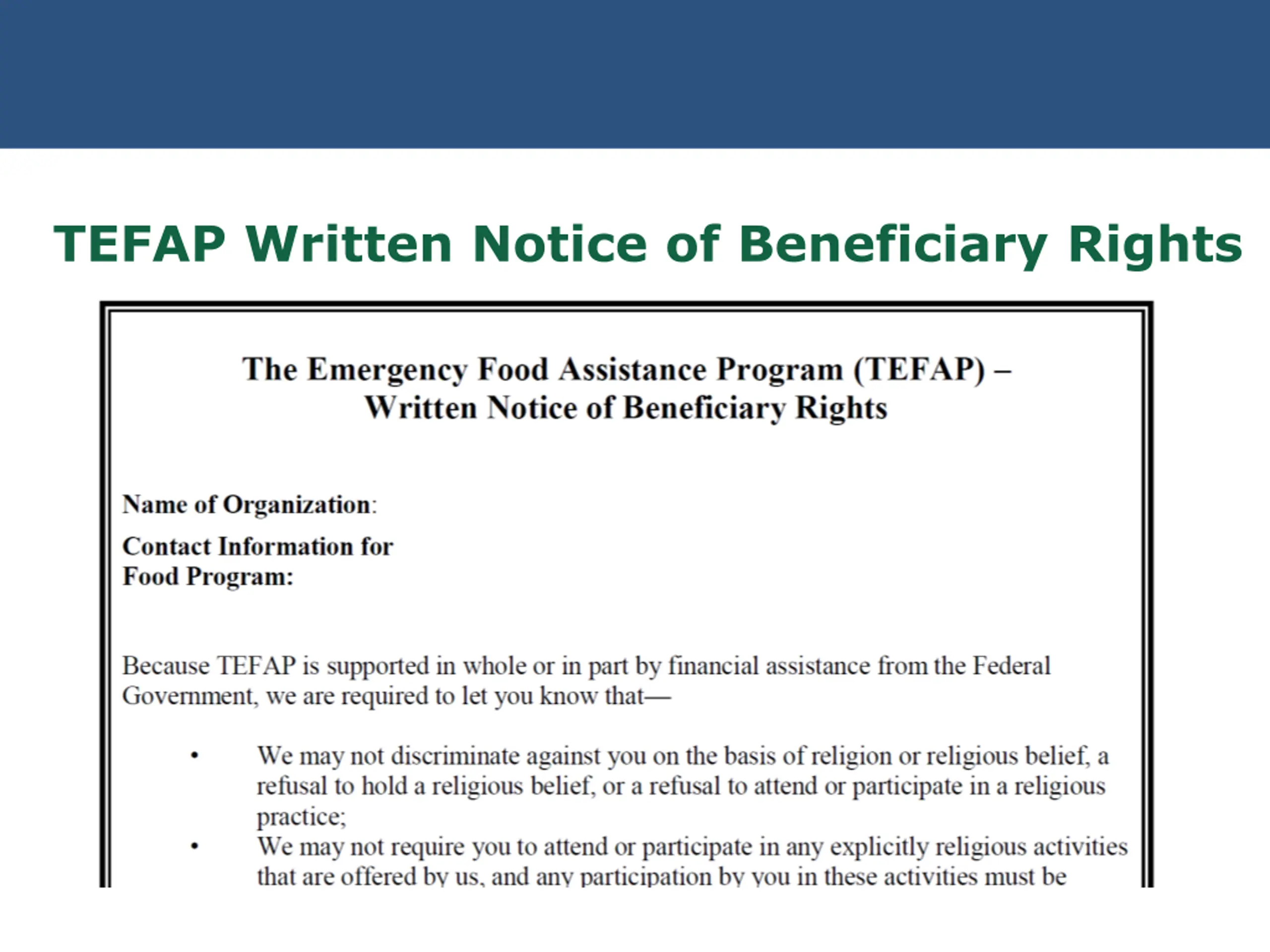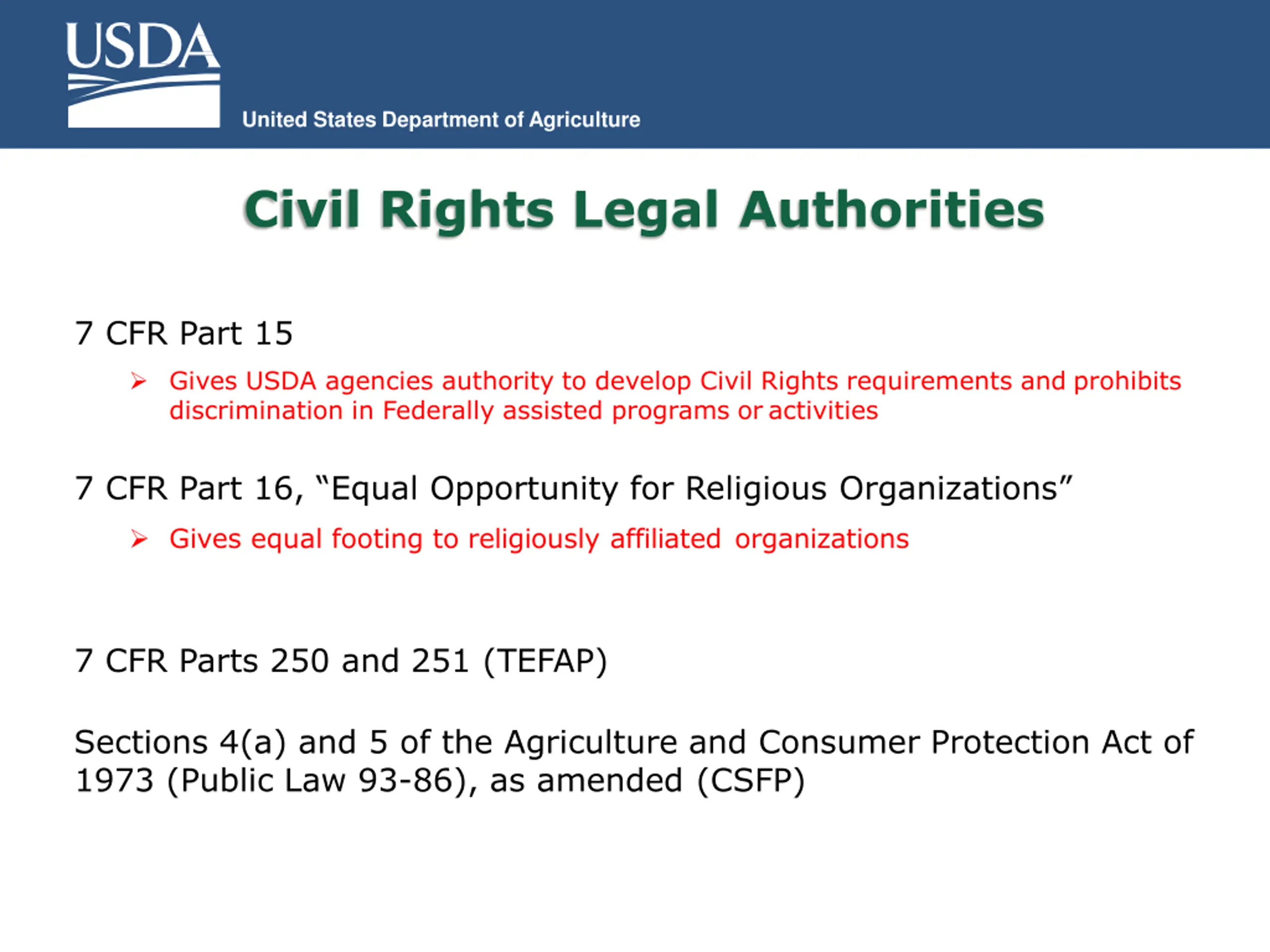 United States Department of Agriculture Civil Rights Legal Authorities 7 CFR Part 15 Gives USDA agencies authority to develop Civil Rights requirements and prohibits discrimination in Federally assisted programs or activities 7 CFR Part 16, Equal Opportunity for Religious Organizations Gives equal footing to religiously affiliated organizations 7 CFR Parts 250 and 251 (TEFAP) Sections 4(a) and 5 of the Agriculture and Consumer Protection Act of 1973 (Public Law 93-86), as amended (CSFP)