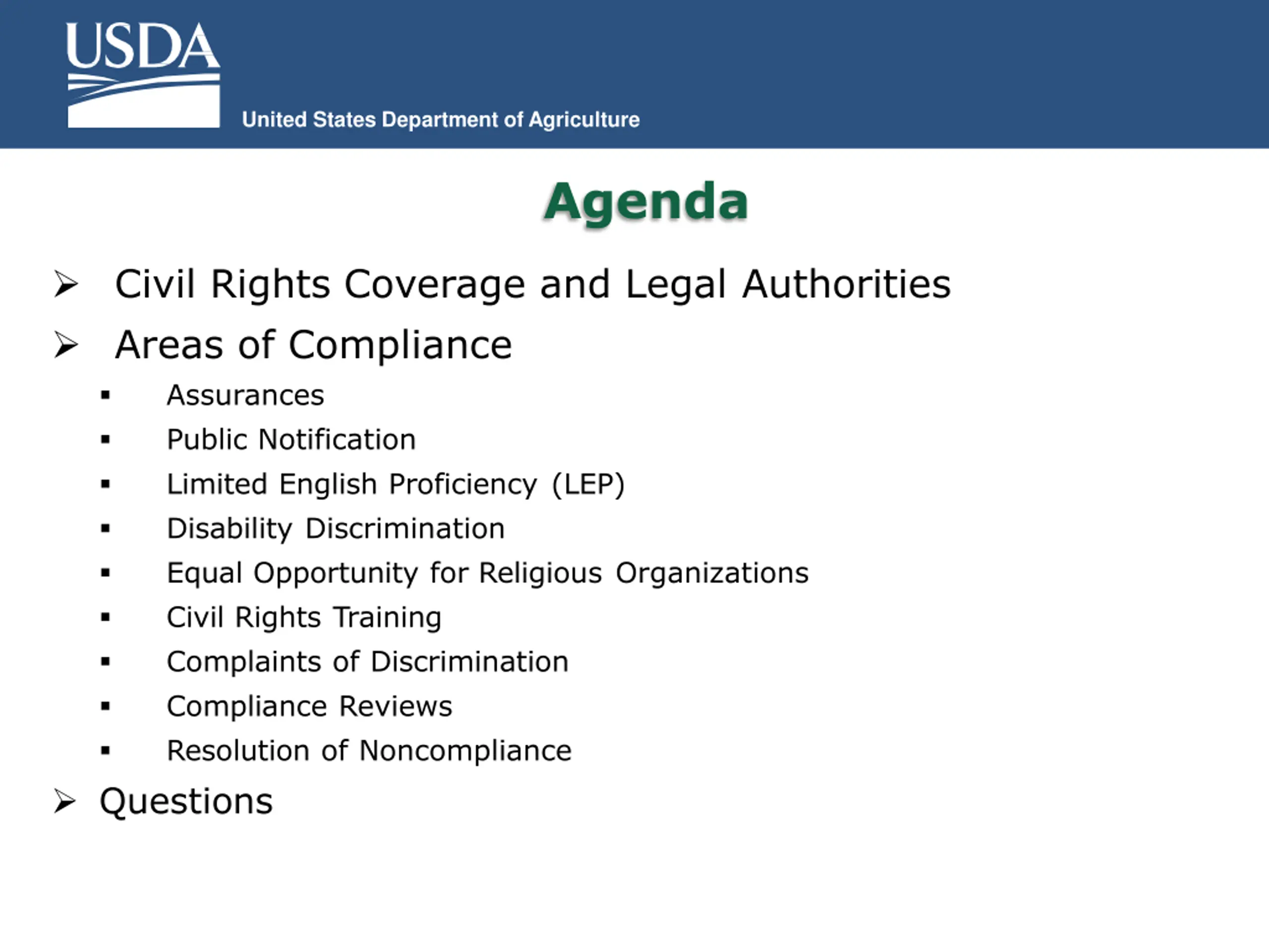 United States Department of Agriculture Agenda Civil Rights Coverage and Legal Authorities Areas of Compliance Assurances Public Notification Limited English Proficiency (LEP) Disability Discrimination Equal Opportunity for Religious Organizations Civil Rights Training Complaints of Discrimination Compliance Reviews Resolution of Noncompliance Questions