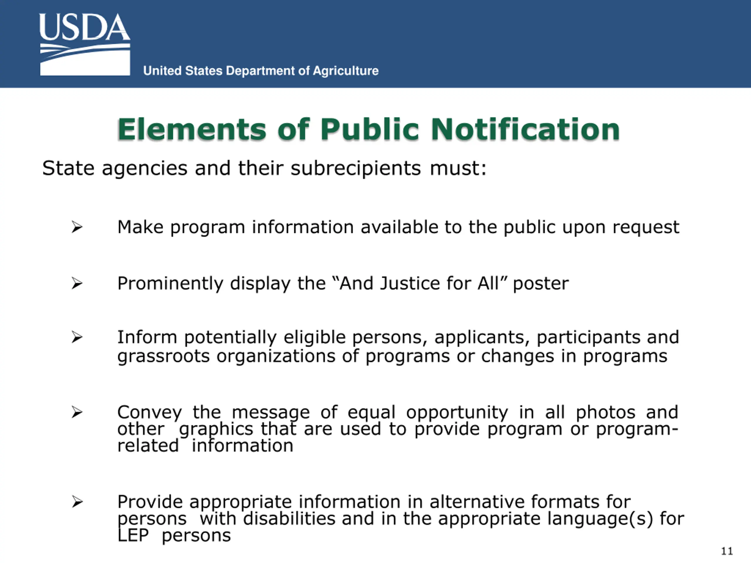 United States Department of Agriculture Elements of Public Notification State agencies and their subrecipients must: Make program information available to the public upon request Prominently display the And Justice for All poster Inform potentially eligible persons, applicants, participants and grassroots organizations of programs or changes in programs Convey the message of equal opportunity in all photos and other graphics that are used to provide program or program- related information Provide appropriate information in alternative formats for persons with disabilities and in the appropriate language(s) for LEP persons 11