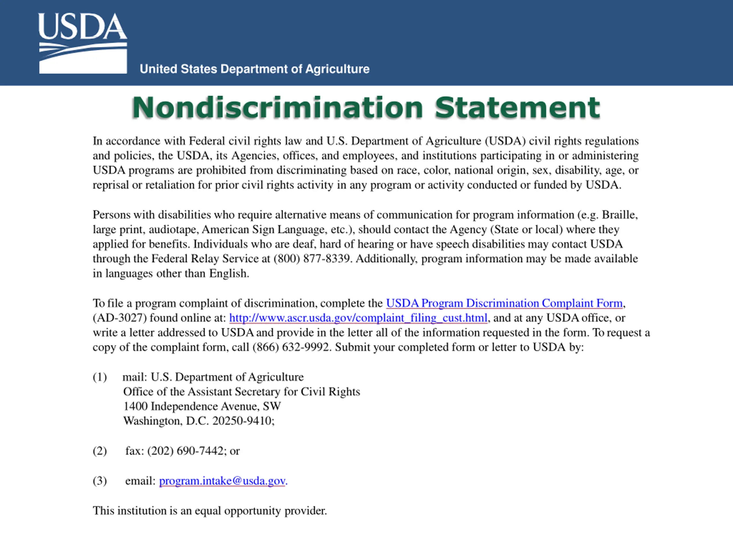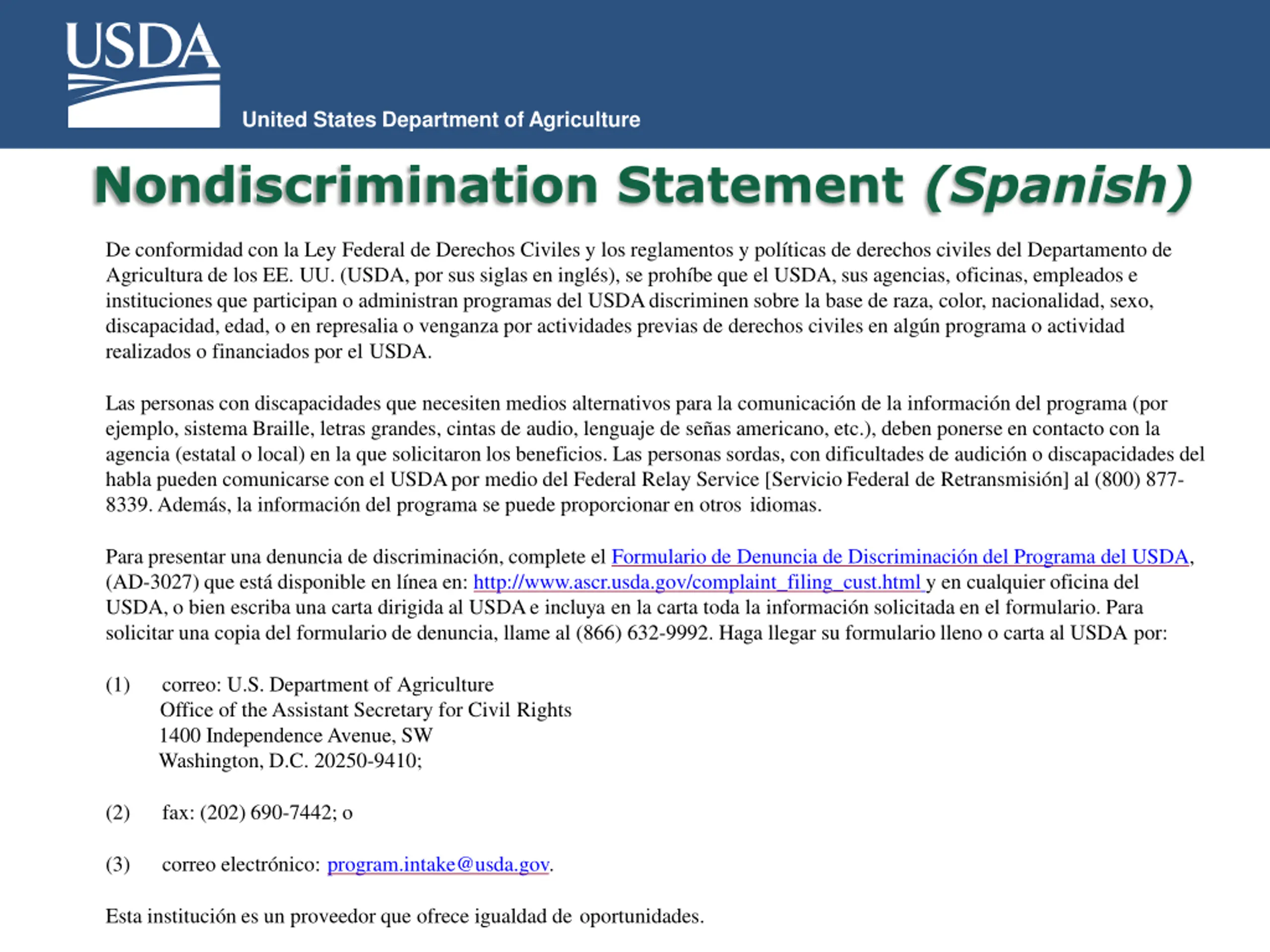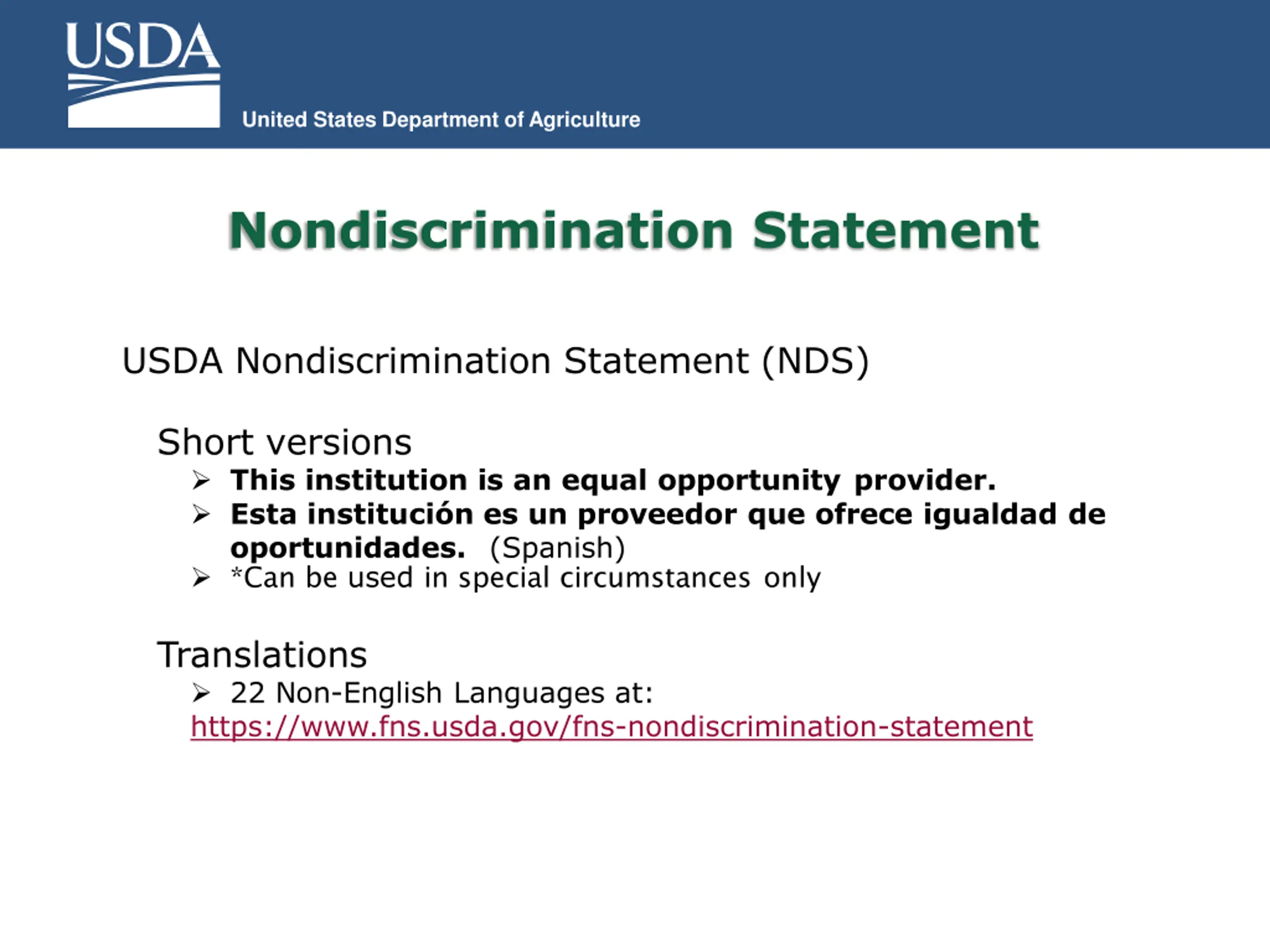 United States Department of Agriculture Nondiscrimination Statement USDA Nondiscrimination Statement (NDS) Short versions This institution is an equal opportunity provider. Esta instituci n es un proveedor que ofrece igualdad de oportunidades. (Spanish) *Can be used in special circumstances only Translations 22 Non-English Languages at: https://www.fns.usda.gov/fns-nondiscrimination-statement