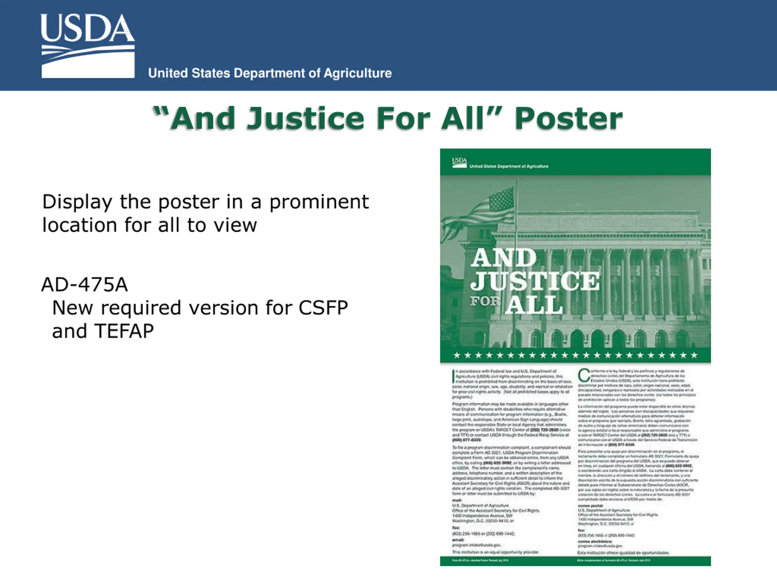 United States Department of Agriculture And Justice For All Poster Display the poster in a prominent location for all to view AD-475A New required version for CSFP and TEFAP