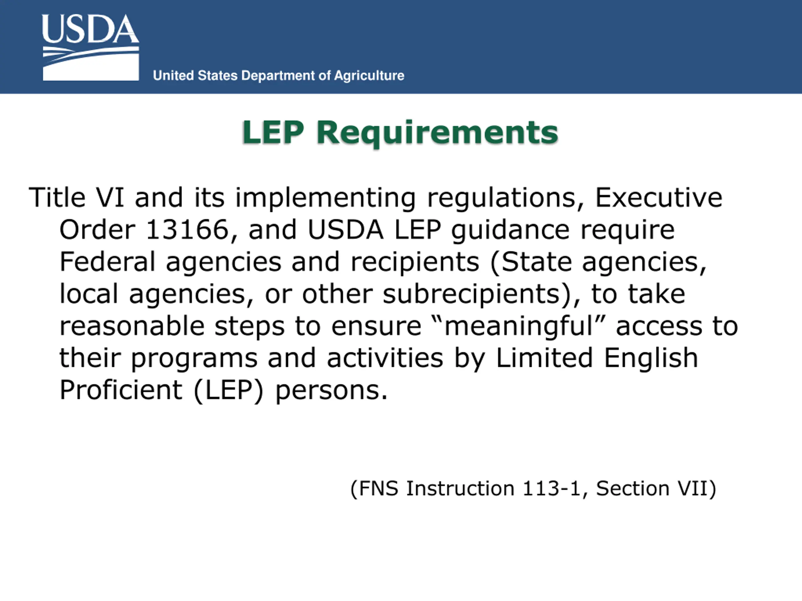 United States Department of Agriculture LEP Requirements Title VI and its implementing regulations, Executive Order 13166, and USDA LEP guidance require Federal agencies and recipients (State agencies, local agencies, or other subrecipients), to take reasonable steps to ensure meaningful access to their programs and activities by Limited English Proficient (LEP) persons. (FNS Instruction 113-1, Section VII)