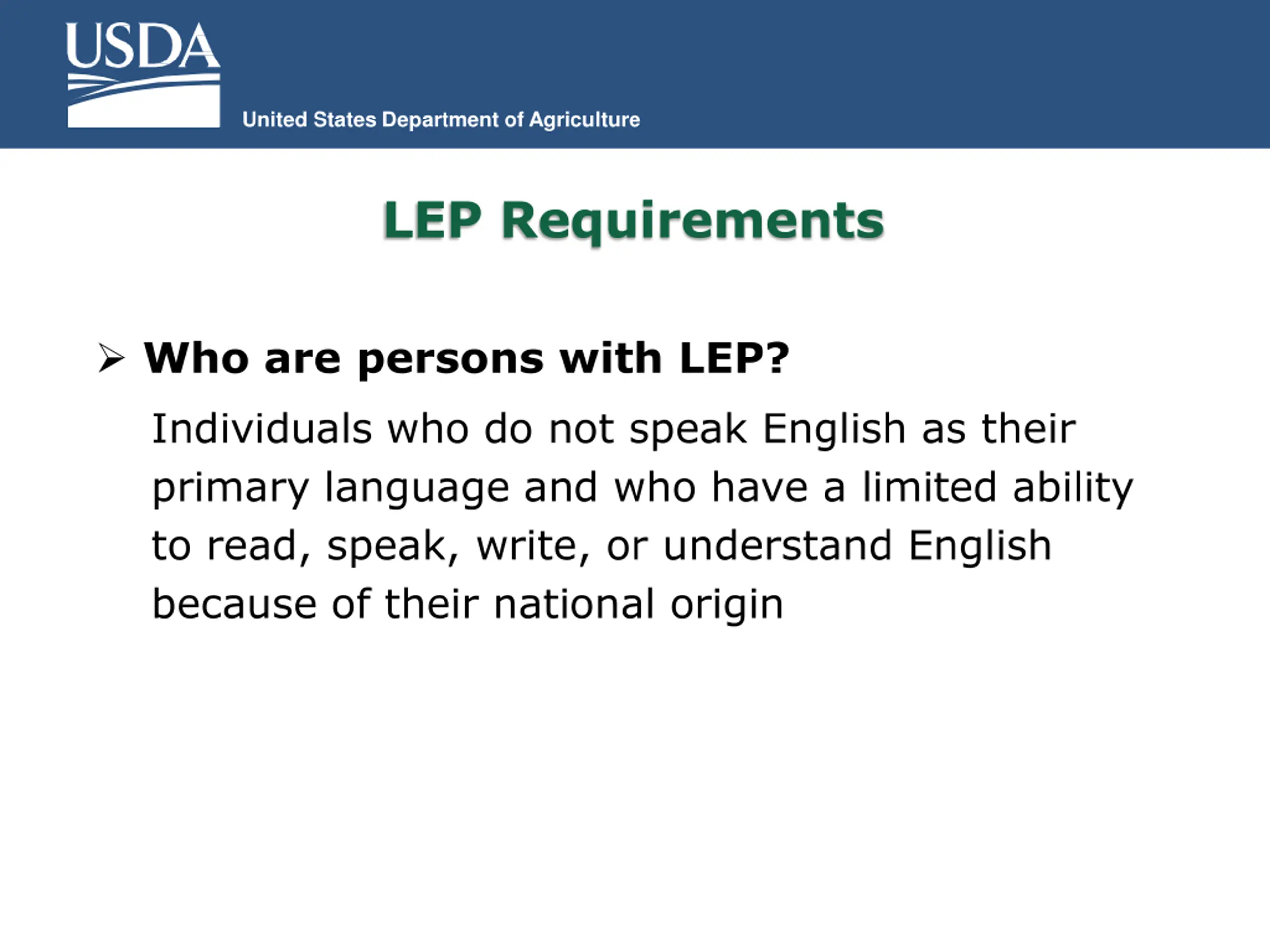 United States Department of Agriculture LEP Requirements Who are persons with LEP? Individuals who do not speak English as their primary language and who have a limited ability to read, speak, write, or understand English because of their national origin