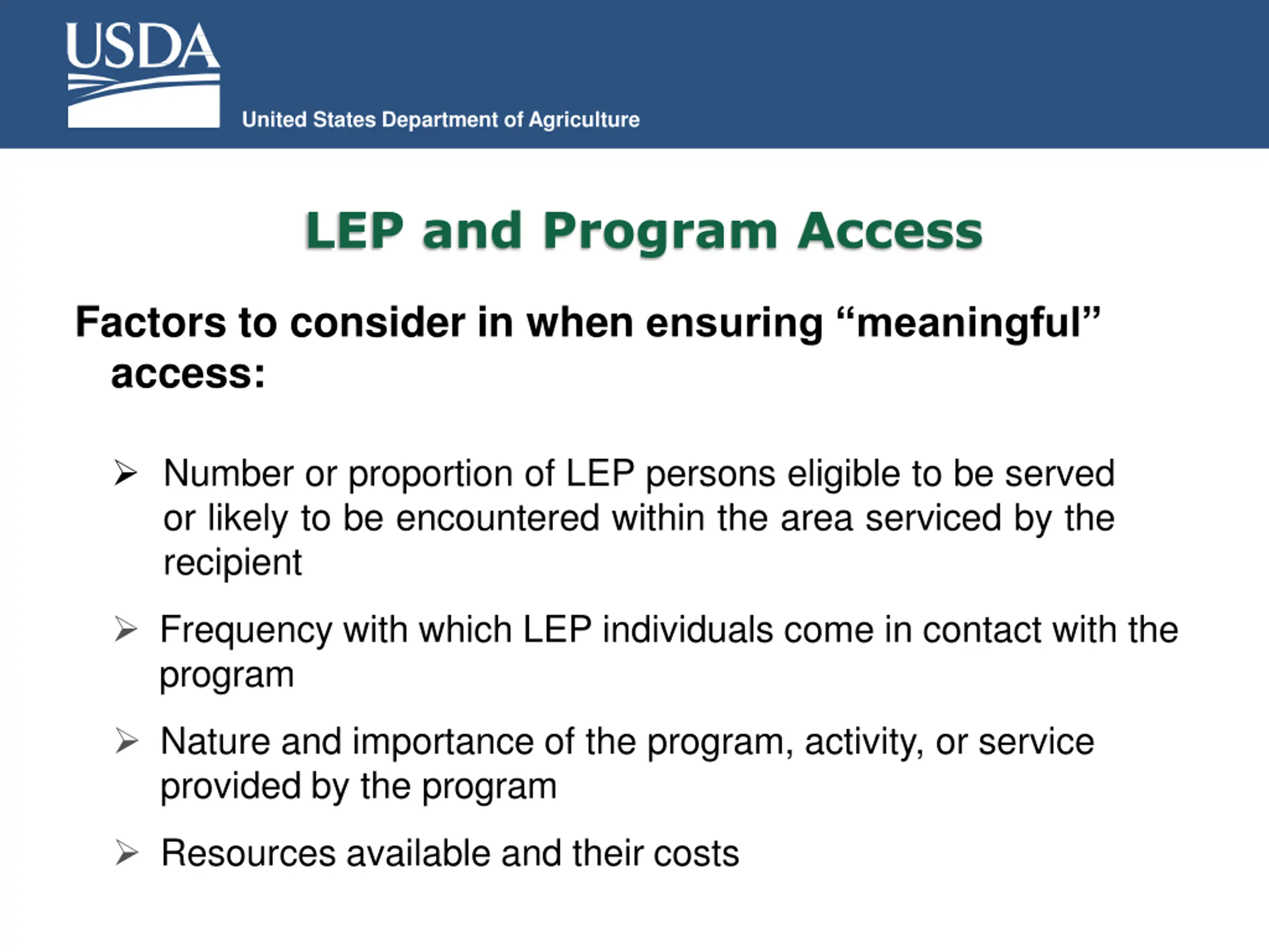 United States Department of Agriculture LEP and Program Access Factors to consider in when ensuring meaningful access: Number or proportion of LEP persons eligible to be served or likely to be encountered within the area serviced by the recipient Frequency with which LEP individuals come in contact with the program Nature and importance of the program, activity, or service provided by the program Resources available and their costs