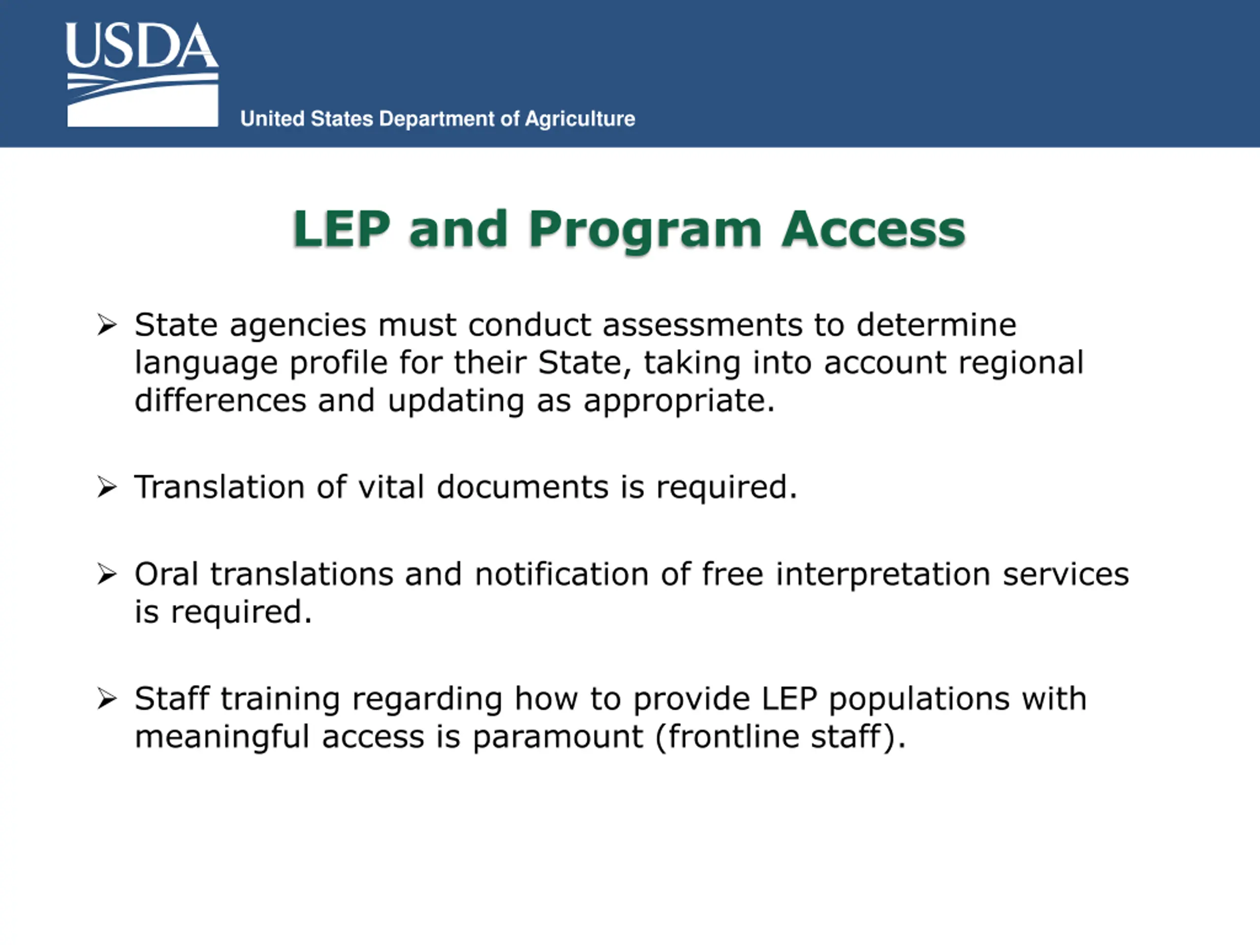 United States Department of Agriculture LEP and Program Access State agencies must conduct assessments to determine language profile for their State, taking into account regional differences and updating as appropriate. Translation of vital documents is required. Oral translations and notification of free interpretation services is required. Staff training regarding how to provide LEP populations with meaningful access is paramount (frontline staff).