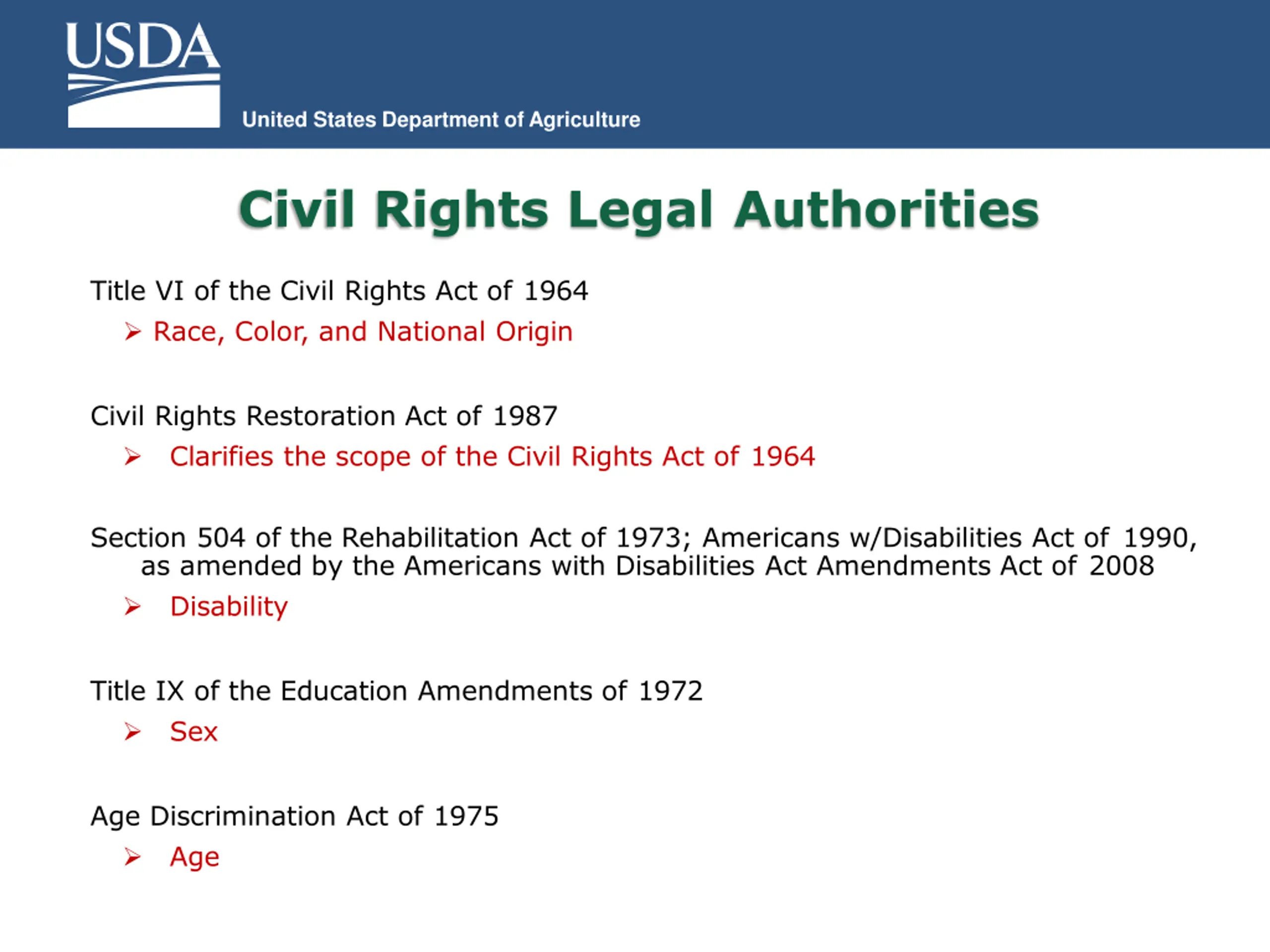 United States Department of Agriculture Civil Rights Legal Authorities Title VI of the Civil Rights Act of 1964 Race, Color, and National Origin Civil Rights Restoration Act of 1987 Clarifies the scope of the Civil Rights Act of 1964 Section 504 of the Rehabilitation Act of 1973; Americans w/Disabilities Act of 1990, as amended by the Americans with Disabilities Act Amendments Act of 2008 Disability Title IX of the Education Amendments of 1972 Sex Age Discrimination Act of 1975 Age