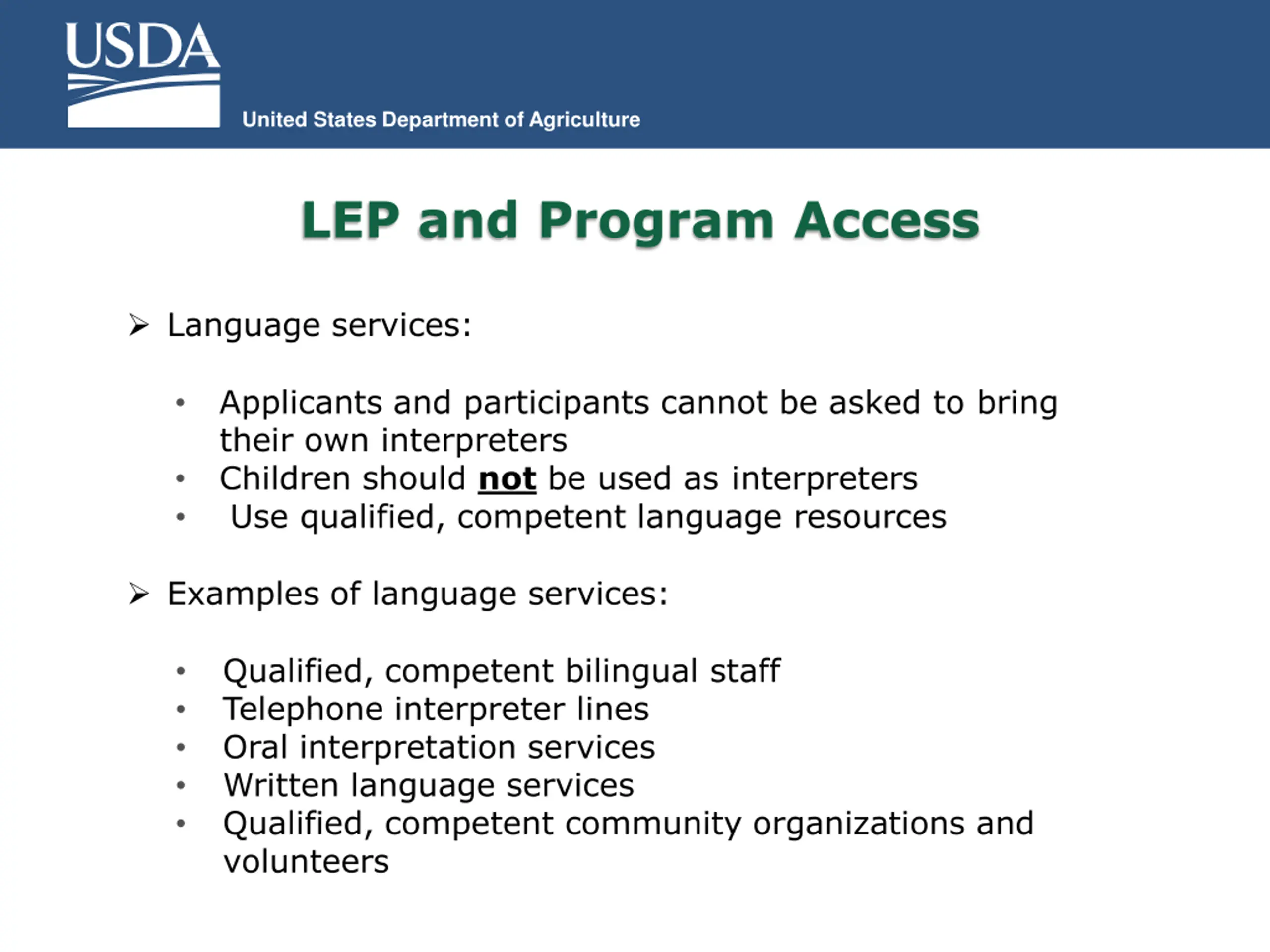 United States Department of Agriculture LEP and Program Access Language services: Applicants and participants cannot be asked to bring their own interpreters Children should not be used as interpreters Use qualified, competent language resources Examples of language services: Qualified, competent bilingual staff Telephone interpreter lines Oral interpretation services Written language services Qualified, competent community organizations and volunteers