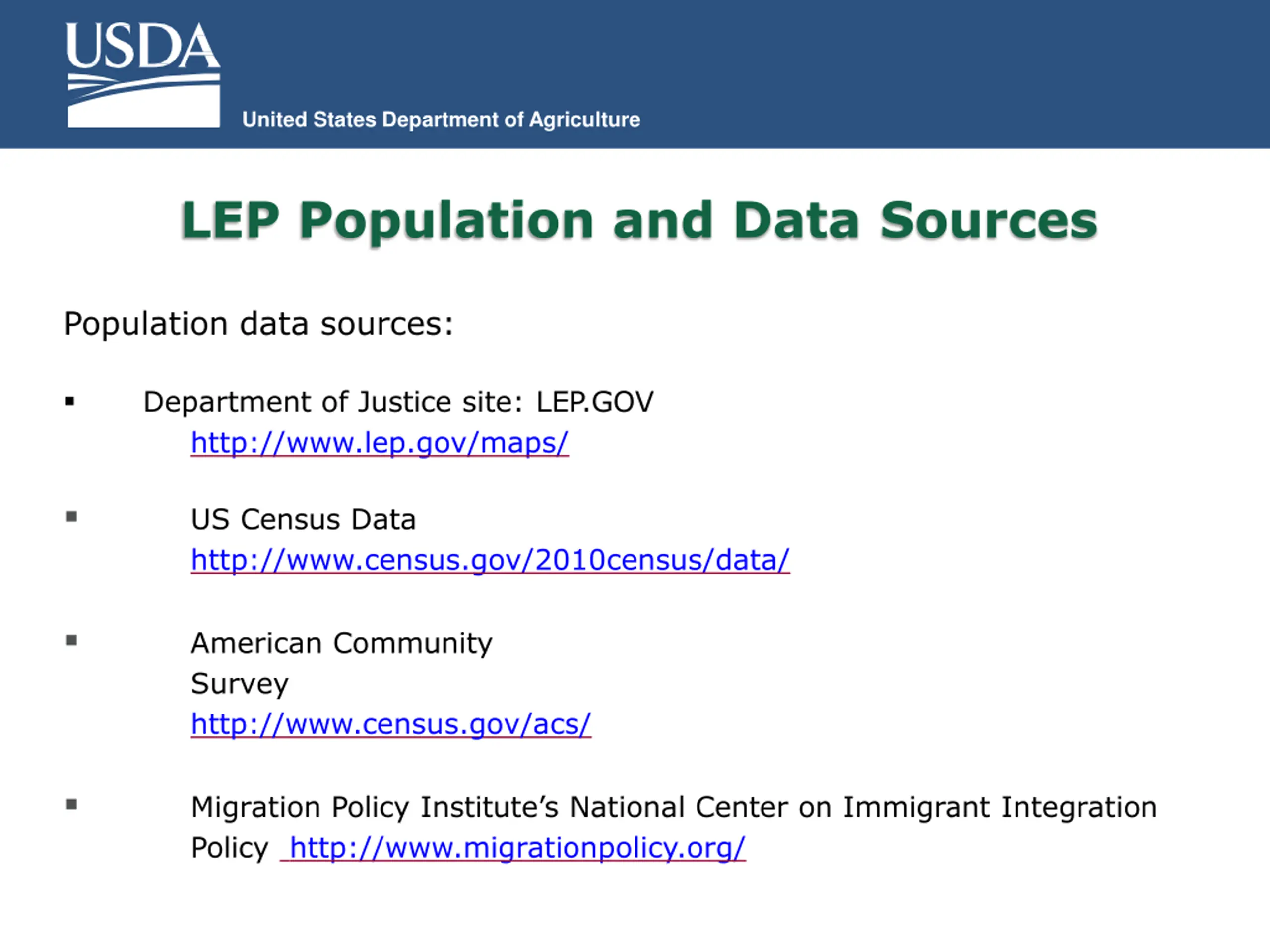 United States Department of Agriculture LEP Population and Data Sources Population data sources: Department of Justice site: LEP.GOV http://www.lep.gov/maps/ US Census Data http://www.census.gov/2010census/data/ American Community Survey http://www.census.gov/acs/ Migration Policy Institute s National Center on Immigrant Integration Policy http://www.migrationpolicy.org/