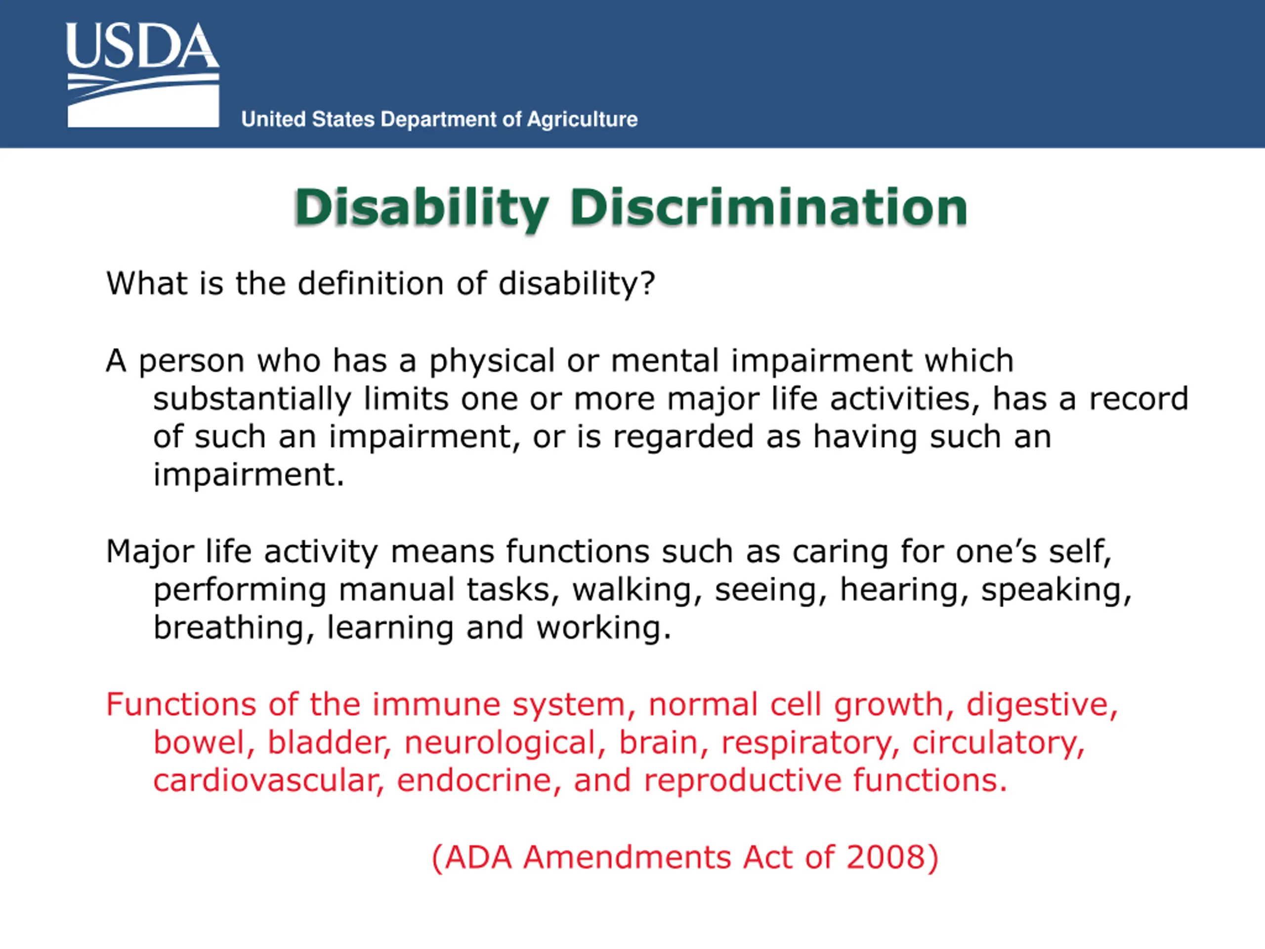 United States Department of Agriculture Disability Discrimination What is the definition of disability? A person who has a physical or mental impairment which substantially limits one or more major life activities, has a record of such an impairment, or is regarded as having such an impairment. Major life activity means functions such as caring for one s self, performing manual tasks, walking, seeing, hearing, speaking, breathing, learning and working. Functions of the immune system, normal cell growth, digestive, bowel, bladder, neurological, brain, respiratory, circulatory, cardiovascular, endocrine, and reproductive functions. (ADA Amendments Act of 2008)