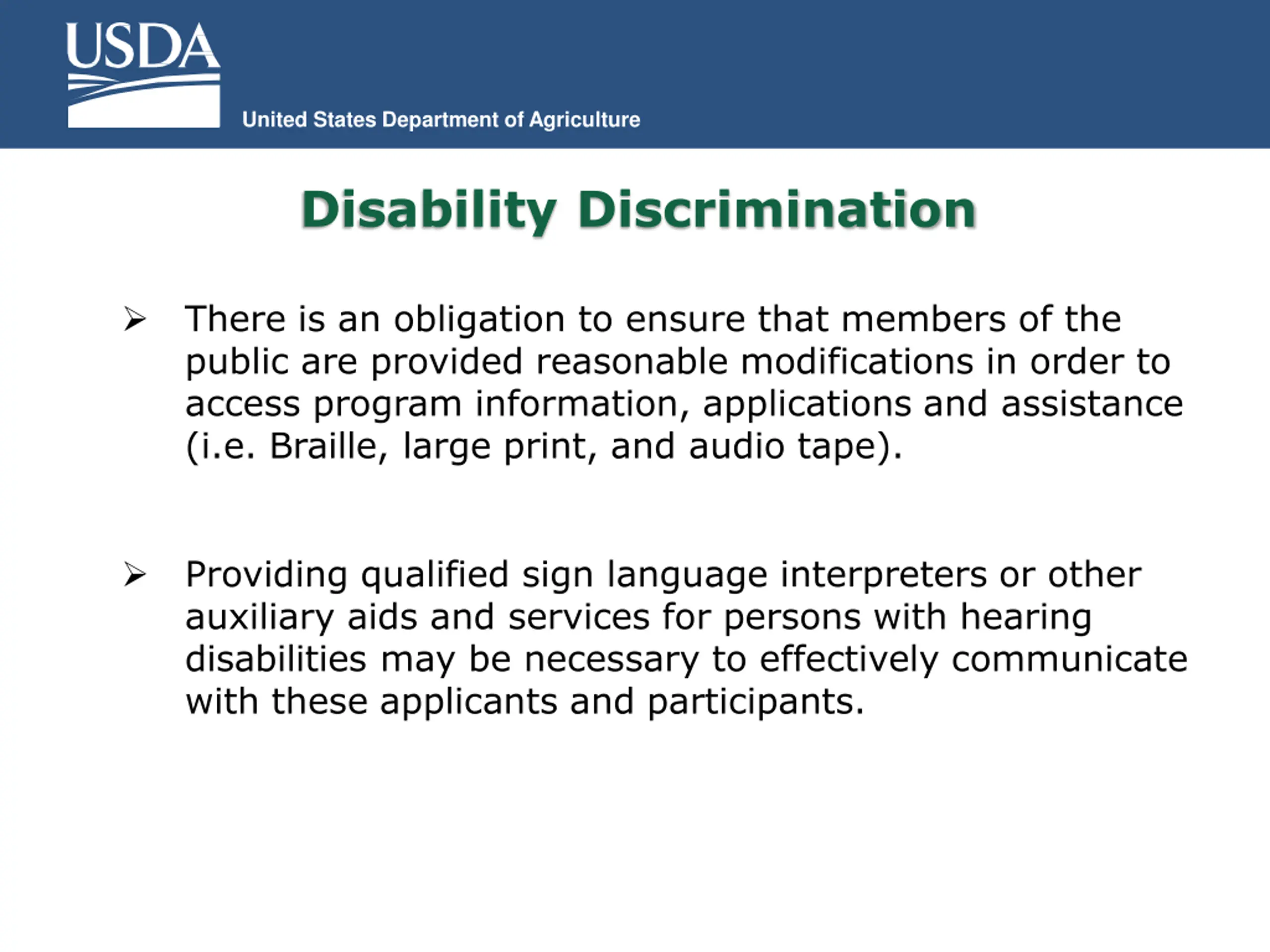 United States Department of Agriculture Disability Discrimination There is an obligation to ensure that members of the public are provided reasonable modifications in order to access program information, applications and assistance (i.e. Braille, large print, and audio tape). Providing qualified sign language interpreters or other auxiliary aids and services for persons with hearing disabilities may be necessary to effectively communicate with these applicants and participants.