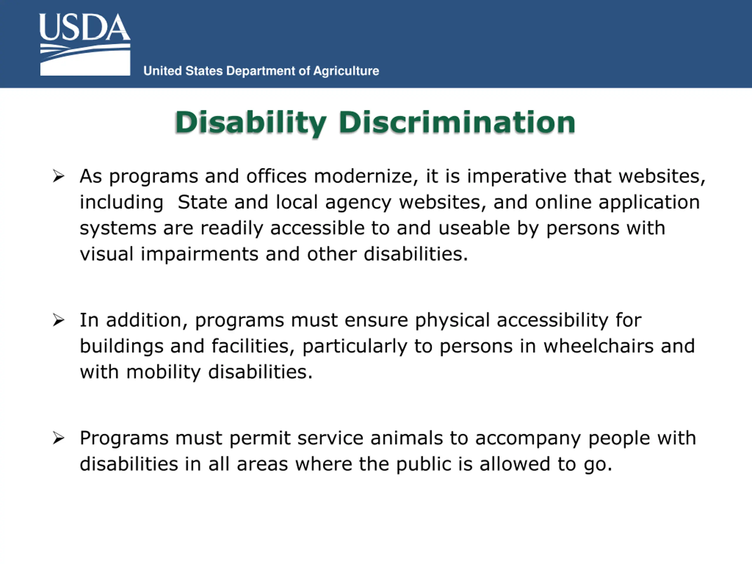 United States Department of Agriculture Disability Discrimination As programs and offices modernize, it is imperative that websites, including State and local agency websites, and online application systems are readily accessible to and useable by persons with visual impairments and other disabilities. In addition, programs must ensure physical accessibility for buildings and facilities, particularly to persons in wheelchairs and with mobility disabilities. Programs must permit service animals to accompany people with disabilities in all areas where the public is allowed to go.