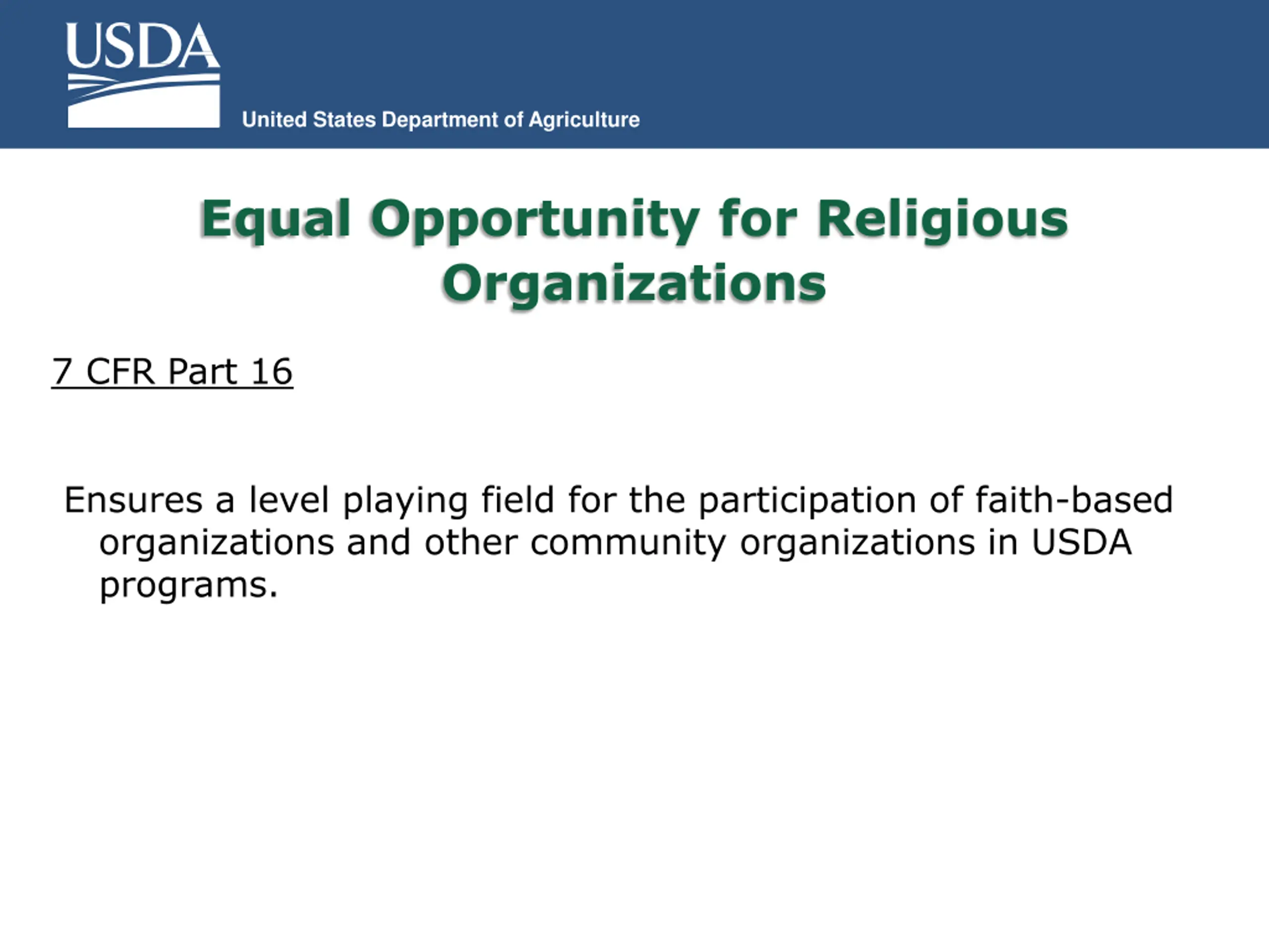 United States Department of Agriculture Equal Opportunity for Religious Organizations 7 CFR Part 16 Ensures a level playing field for the participation of faith-based organizations and other community organizations in USDA programs.