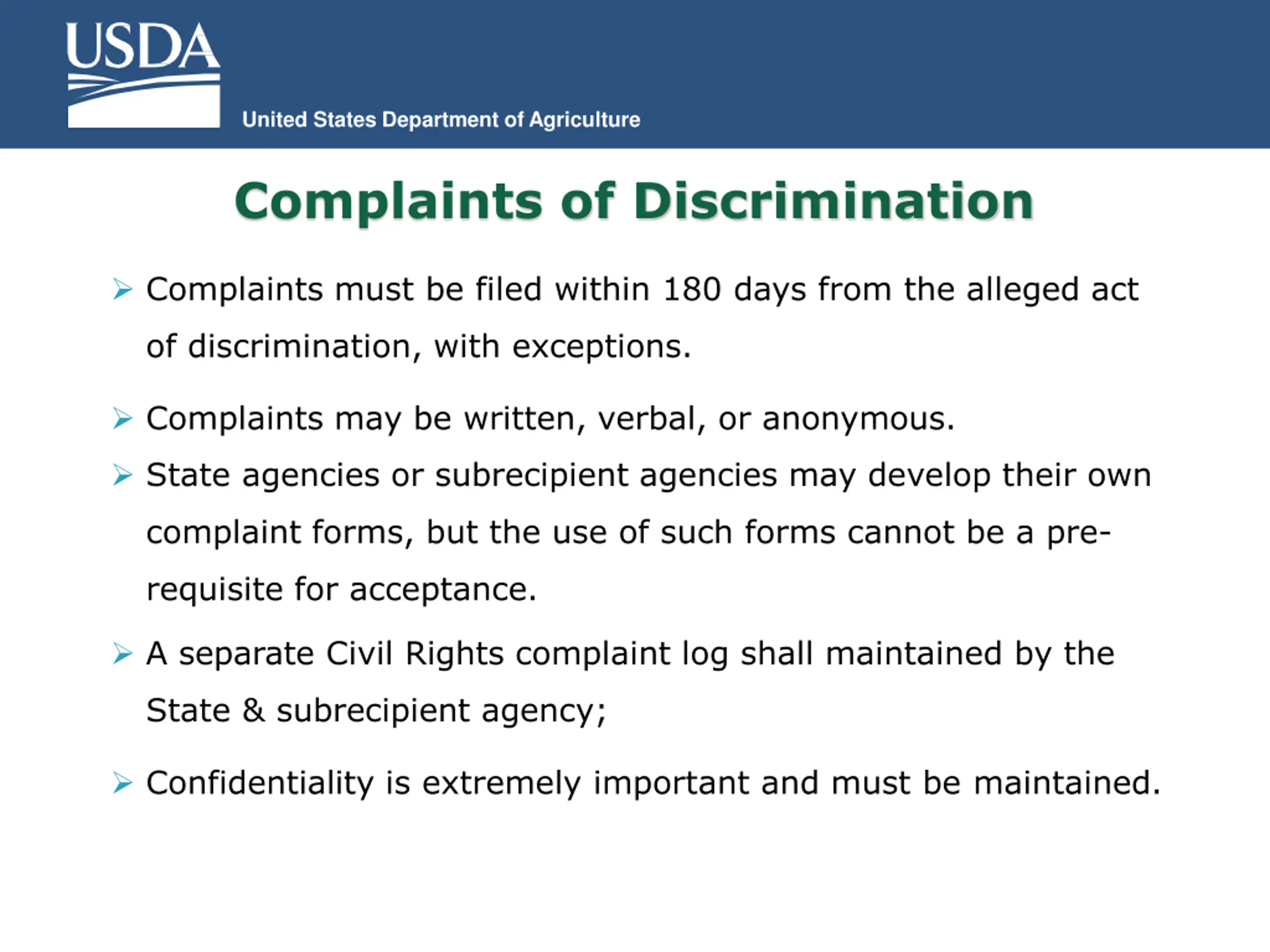 United States Department of Agriculture Complaints of Discrimination Complaints must be filed within 180 days from the alleged act of discrimination, with exceptions. Complaints may be written, verbal, or anonymous. State agencies or subrecipient agencies may develop their own complaint forms, but the use of such forms cannot be a pre- requisite for acceptance. A separate Civil Rights complaint log shall maintained by the State & subrecipient agency; Confidentiality is extremely important and must be maintained.