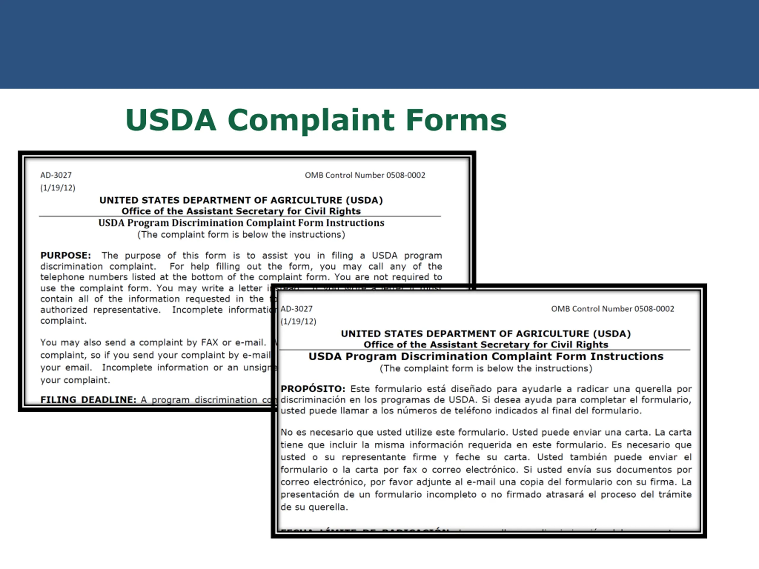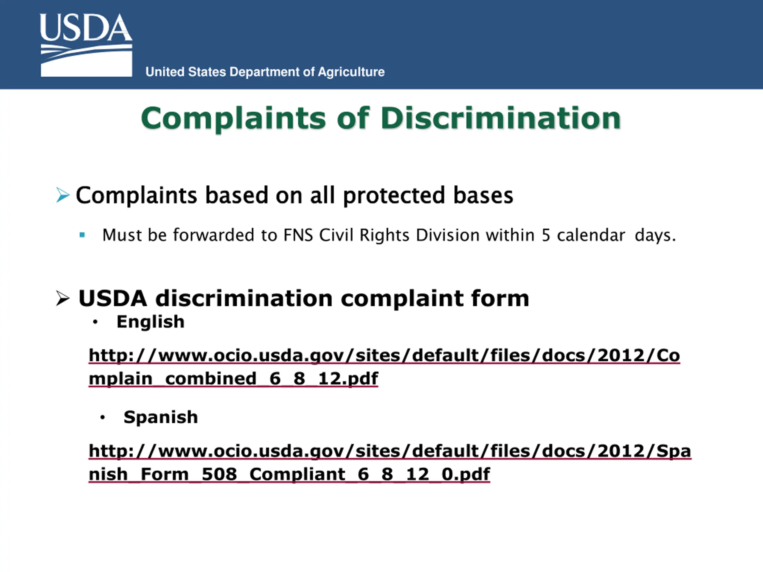 United States Department of Agriculture Complaints of Discrimination Complaints based on Complaints based on all all protected bases protected bases Must be forwarded to FNS Civil Rights Division within 5 calendar days. USDA discrimination complaint form English http://www.ocio.usda.gov/sites/default/files/docs/2012/Co mplain_combined_6_8_12.pdf Spanish http://www.ocio.usda.gov/sites/default/files/docs/2012/Spa nish_Form_508_Compliant_6_8_12_0.pdf